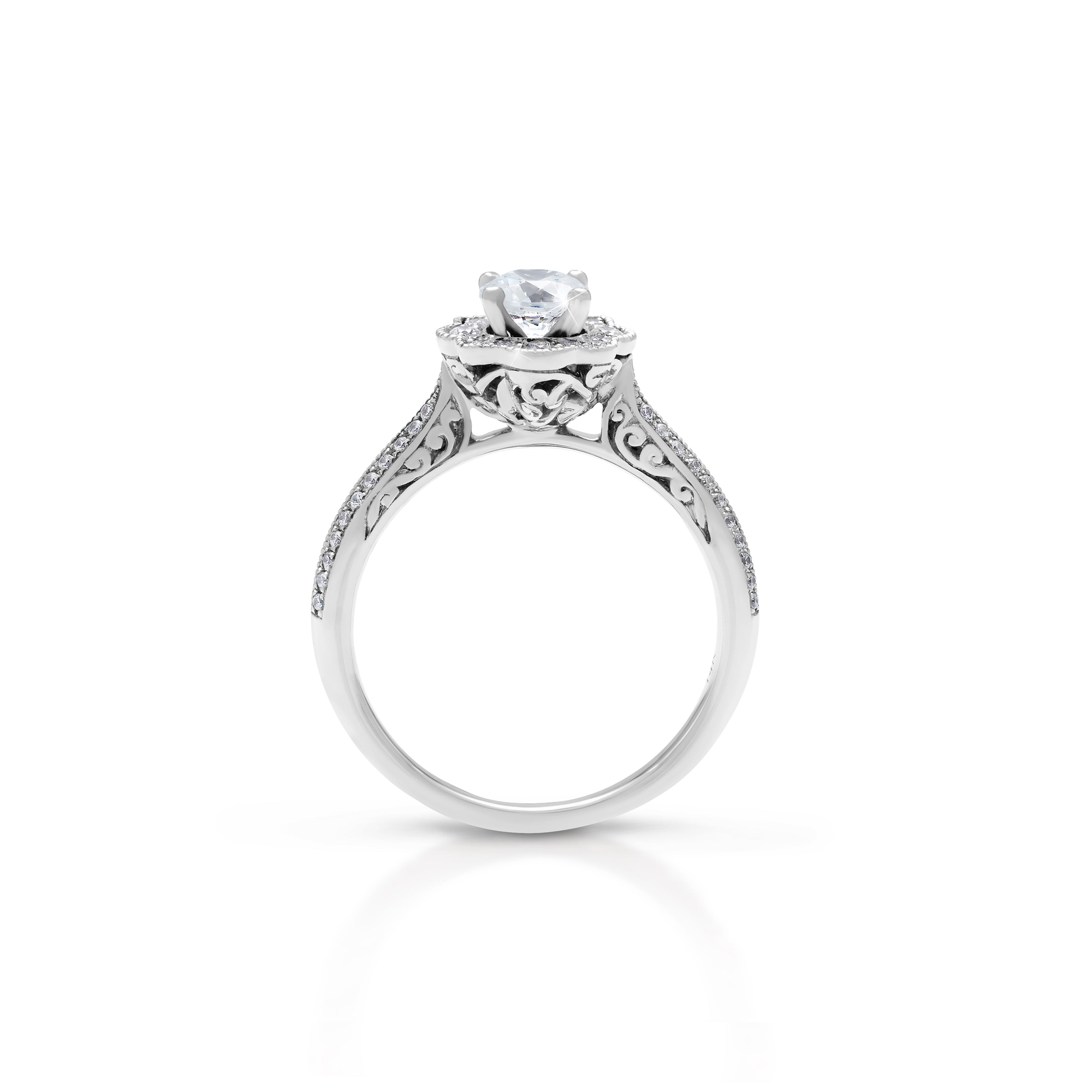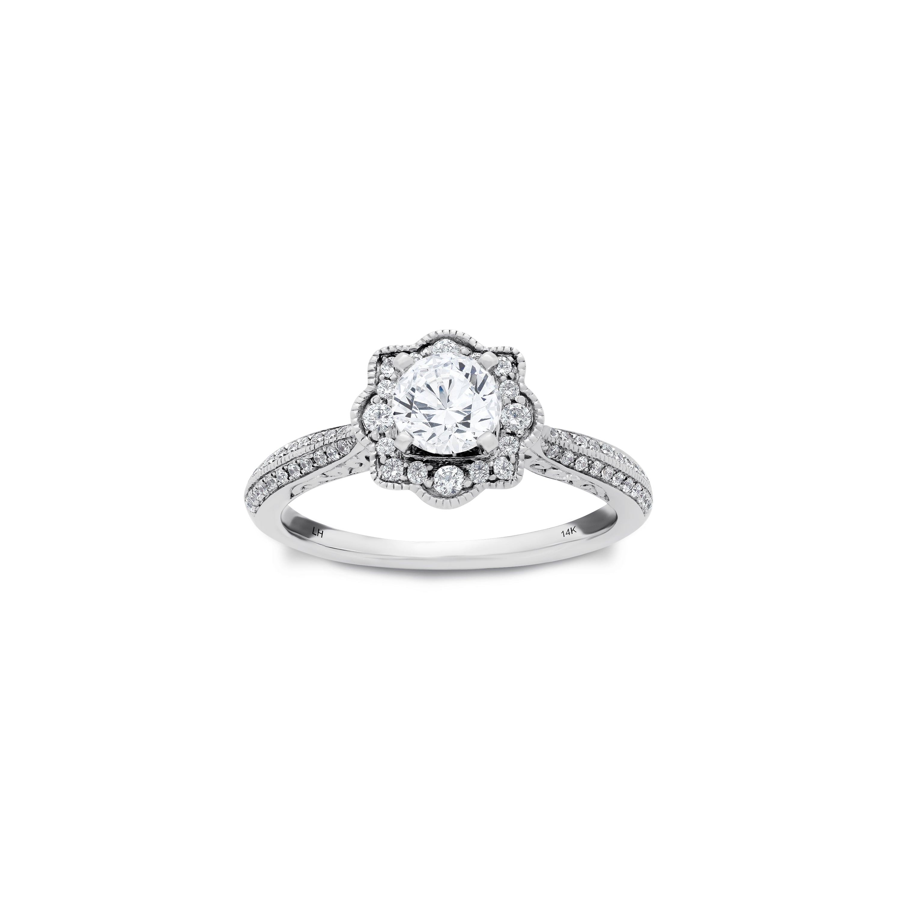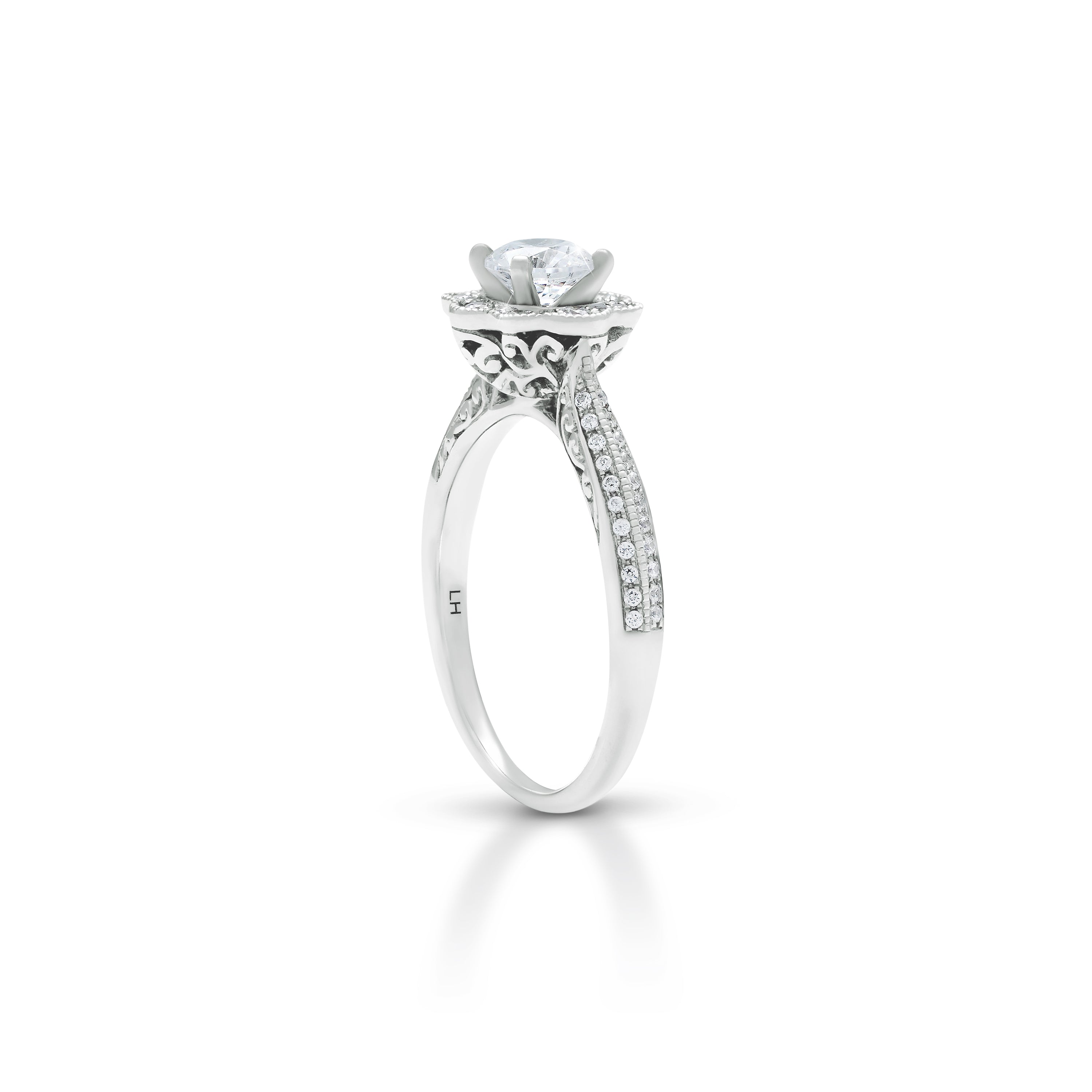 Breathtakingly elegant, this exquisite Lois Hill Scroll Floral Diamond Halo 0.25 ct. Engagement Ring, is where artistry and romance intertwine in a dance of sublime beauty.  With a delicate LH scroll design floral basket adorned by a halo of dazzling diamonds, and enhanced with a double row of diamonds on the band this enchanting ring is a radiant symbol of a love story that is eternally blooming.
