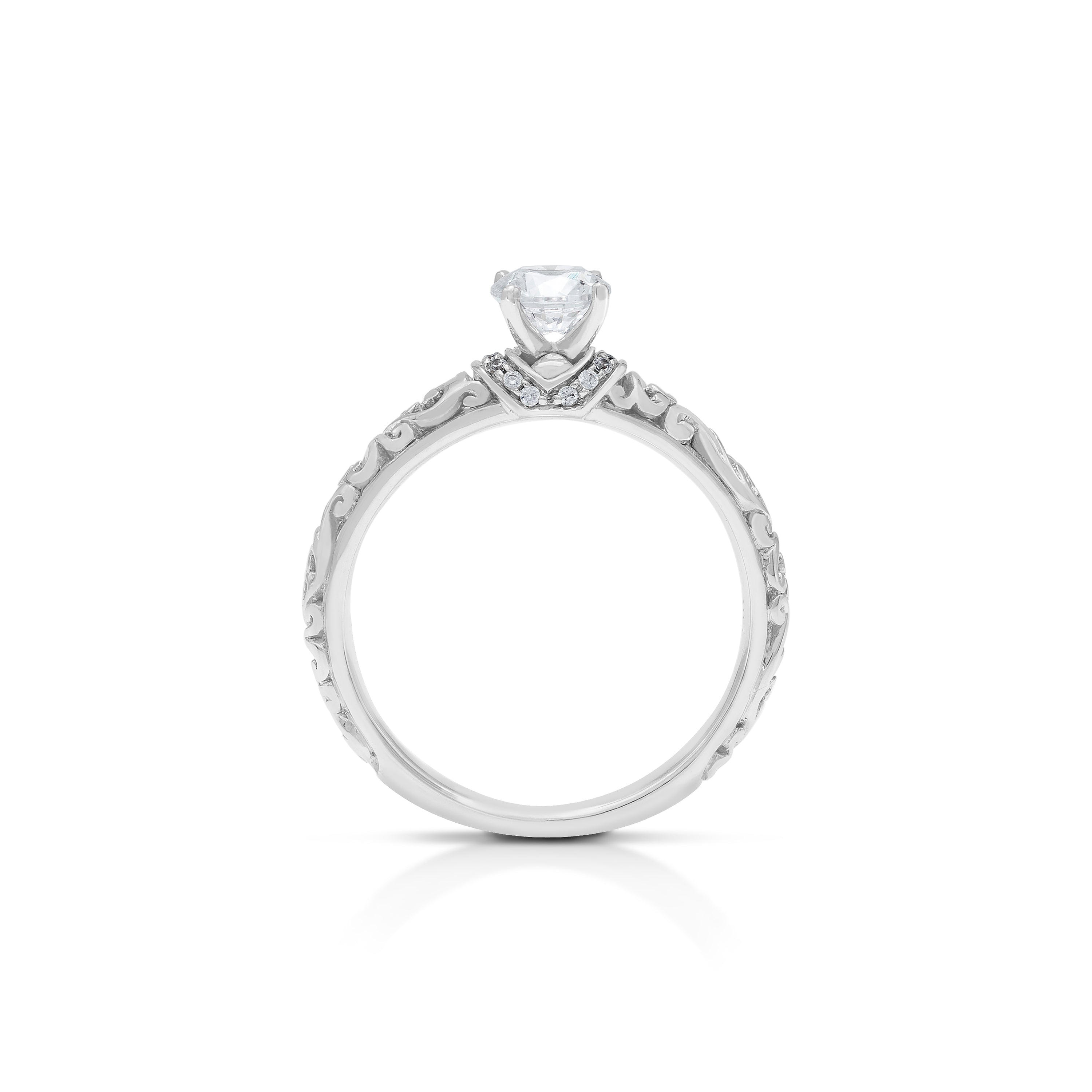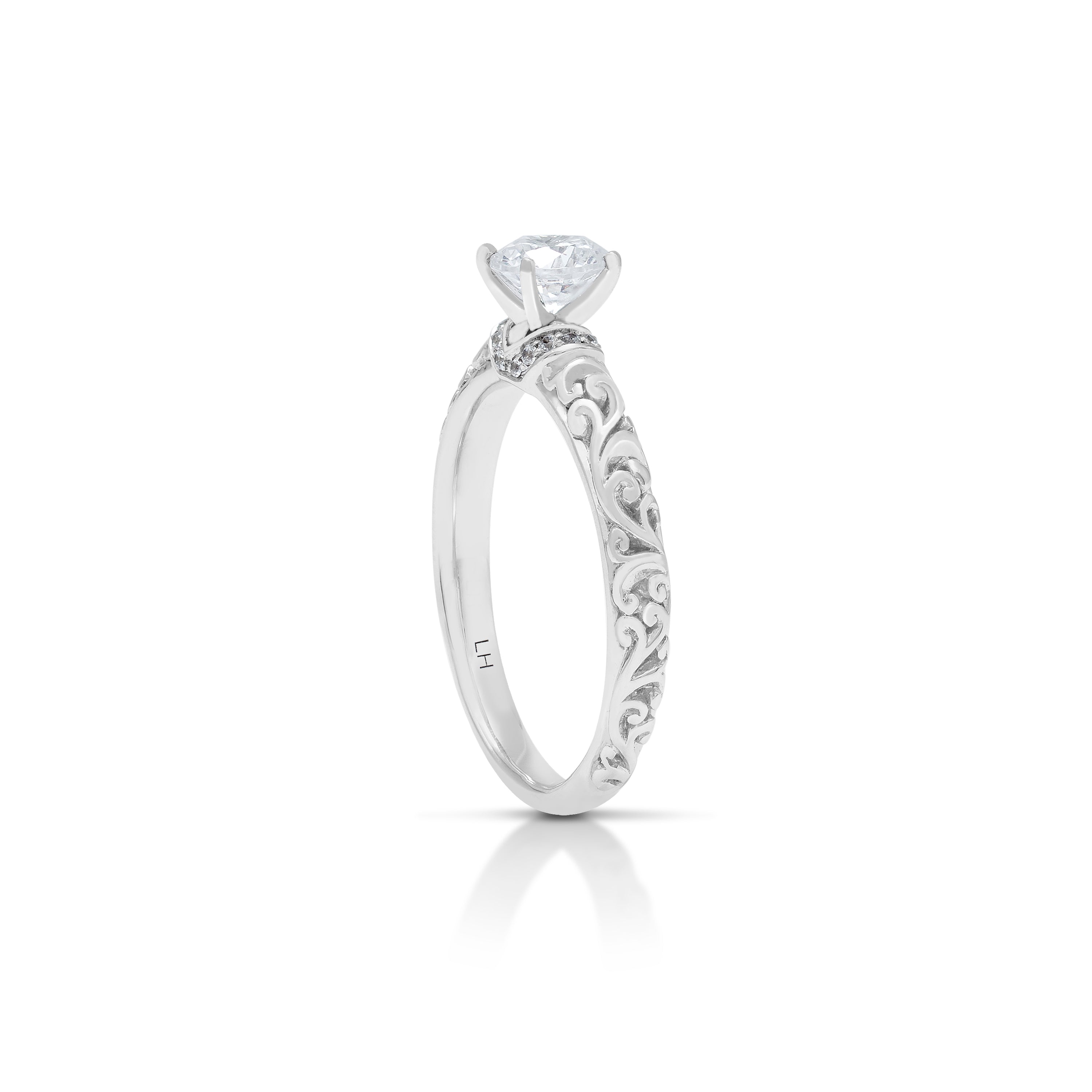 In the tender embrace of this exquisite Lois Hill Hand-carved Scroll Solitaire 2.3 mm Engagement Ring, love's timeless journey unfolds.  A mesmerizing diamond of your choice, with 0.05 ct accents and delicately set amidst the intricately sculpted LH scroll, becomes a brilliant symbol of eternal love.