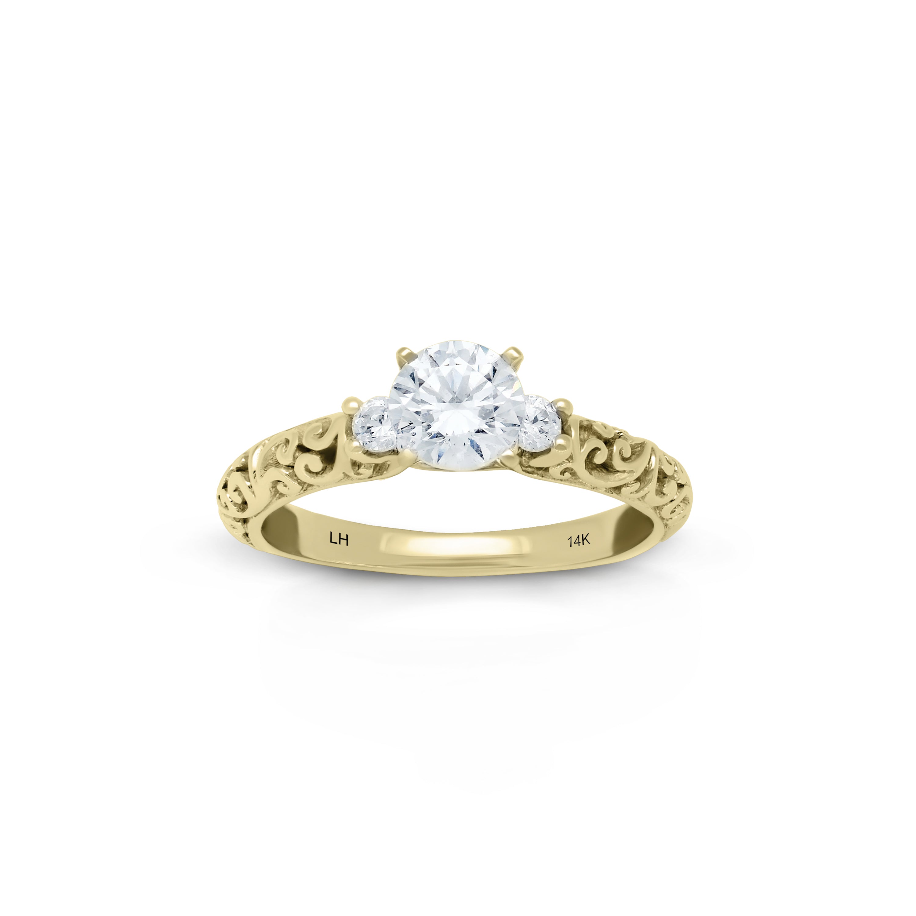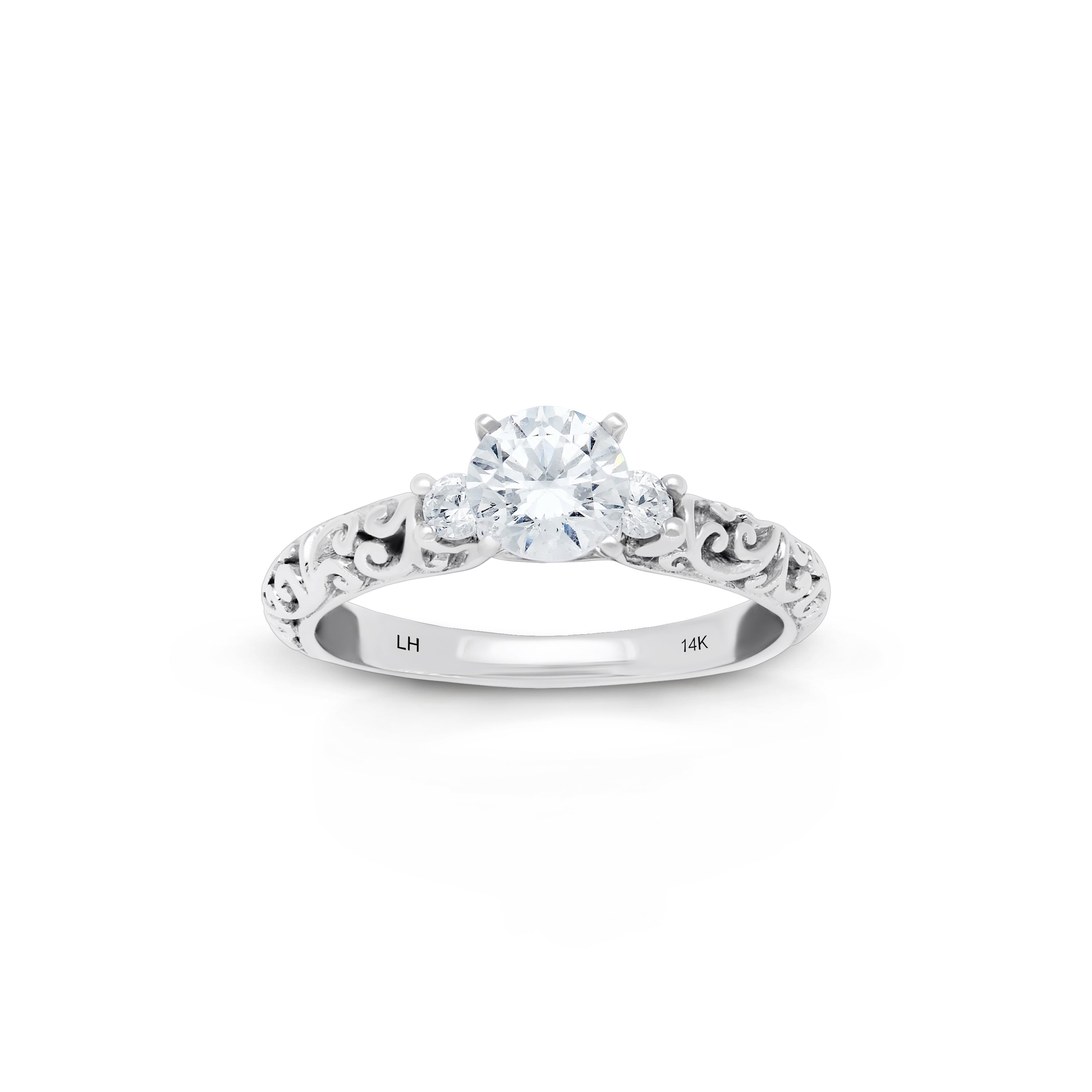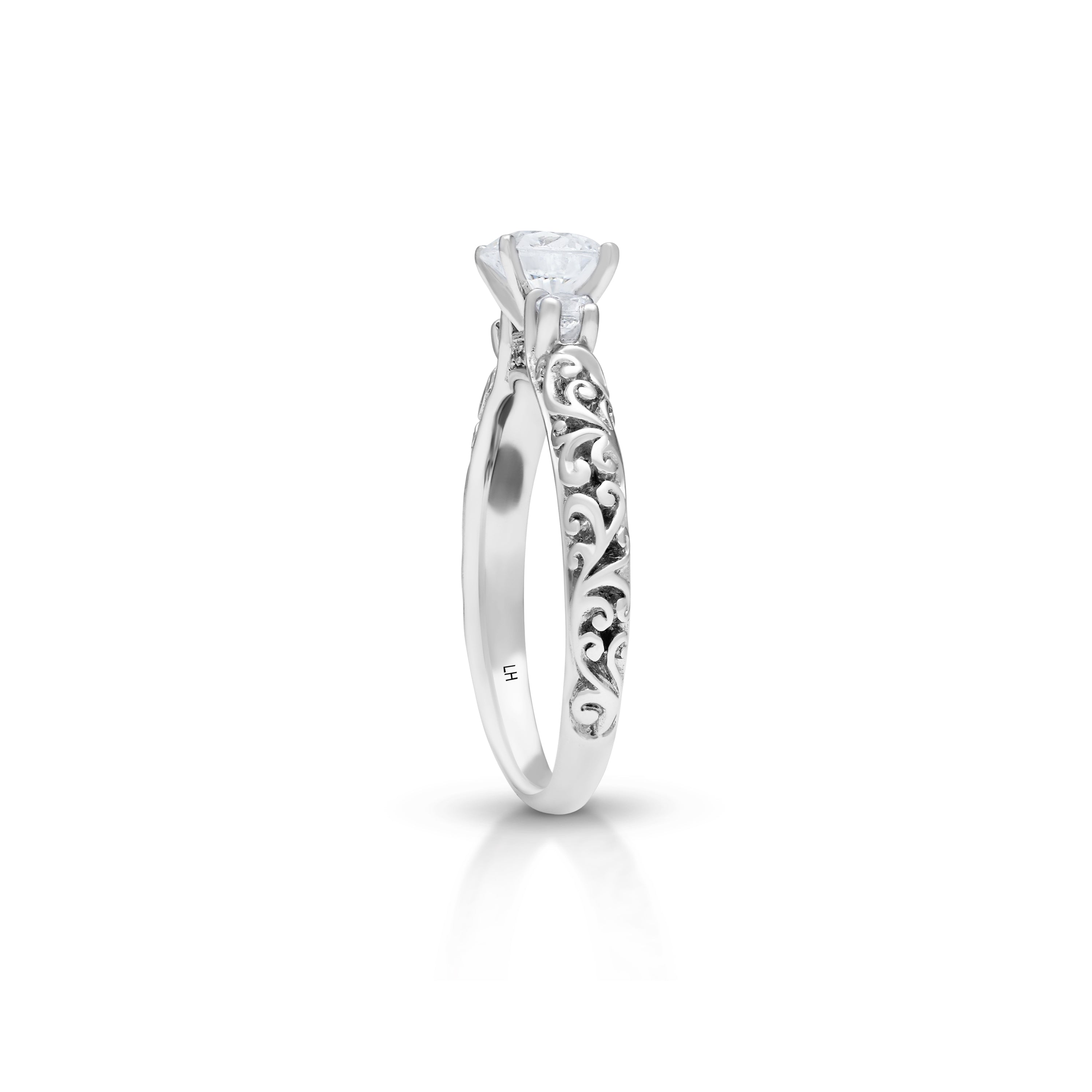 This stunning, precious Lois Hill Hand-Carved Scroll Repousse Bostonian Engagement Ring is a masterpiece of exquisite craftsmanship.   Meticulously Hand-Carved LH Scroll Repousse details adorn the band, elegantly embracing two 0.12 ct side stones, symbolizing the enduring bond between two souls, while evoking a sense of timeless beauty.