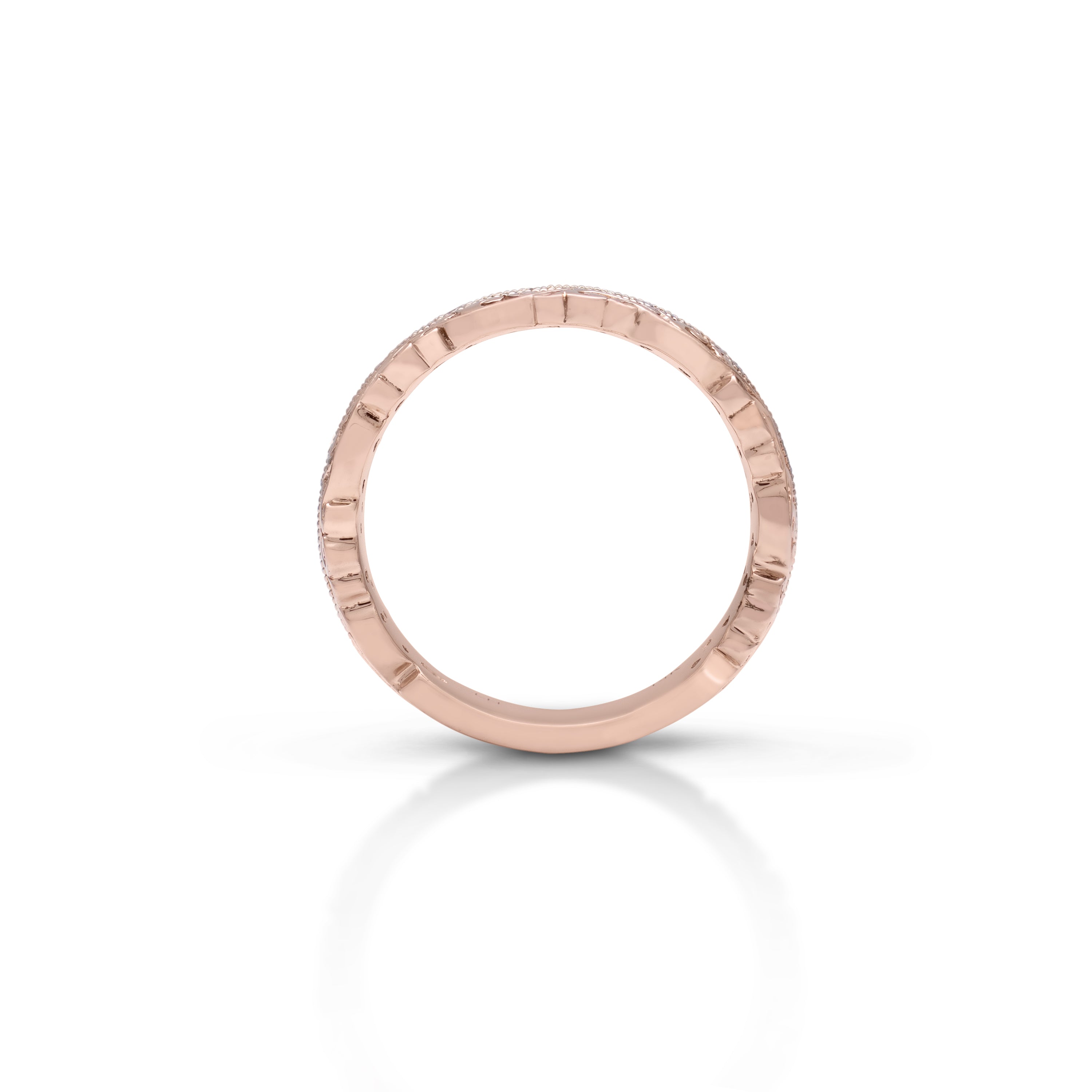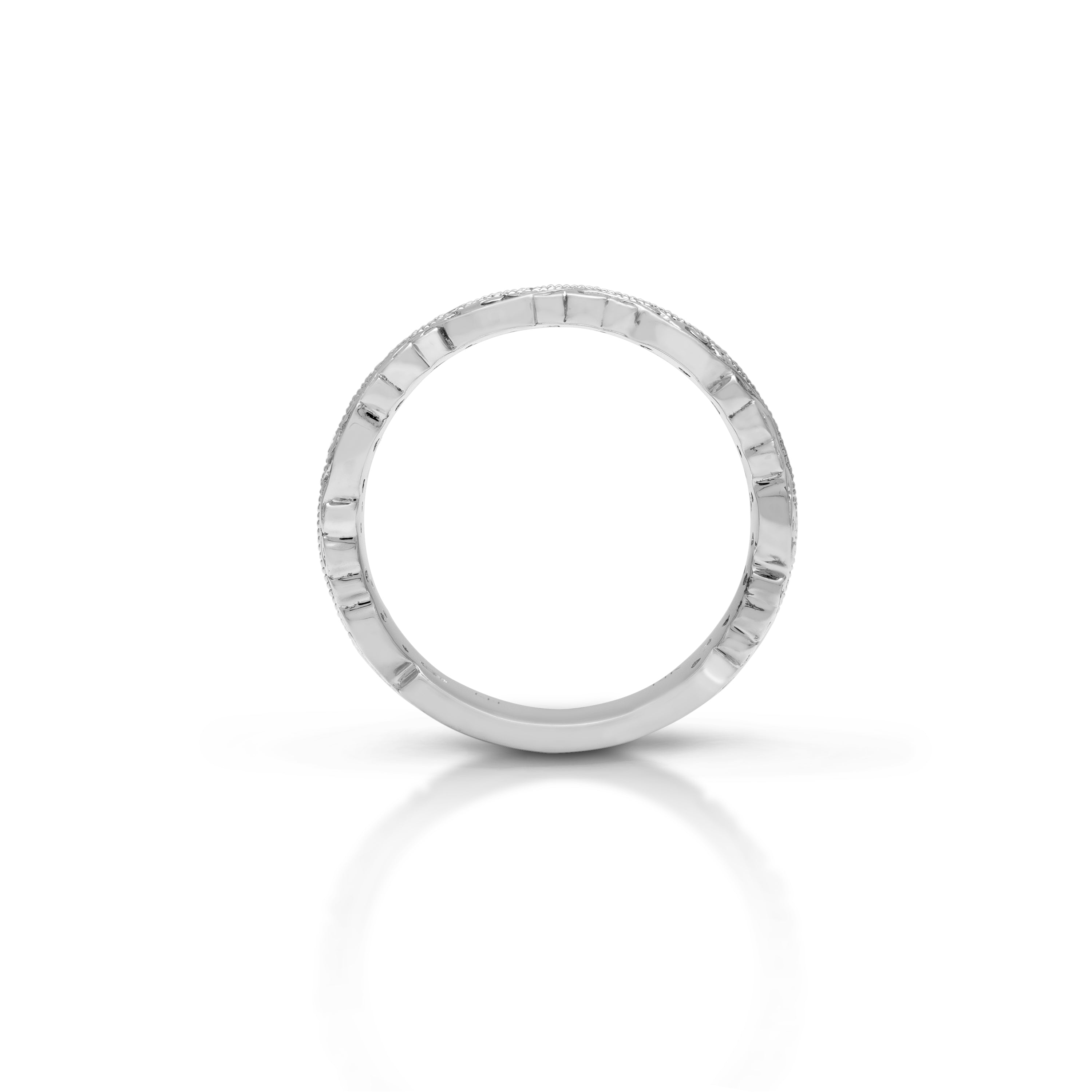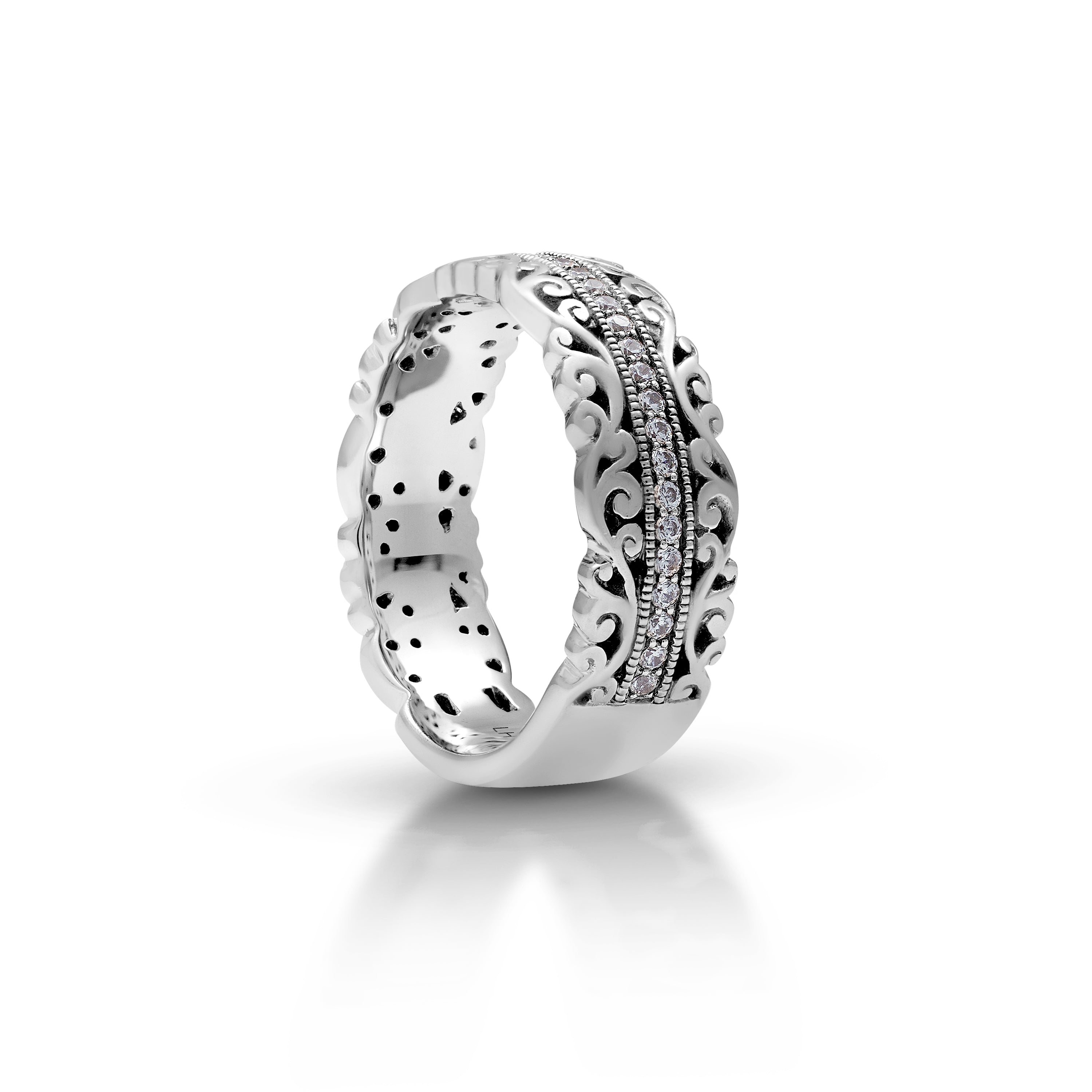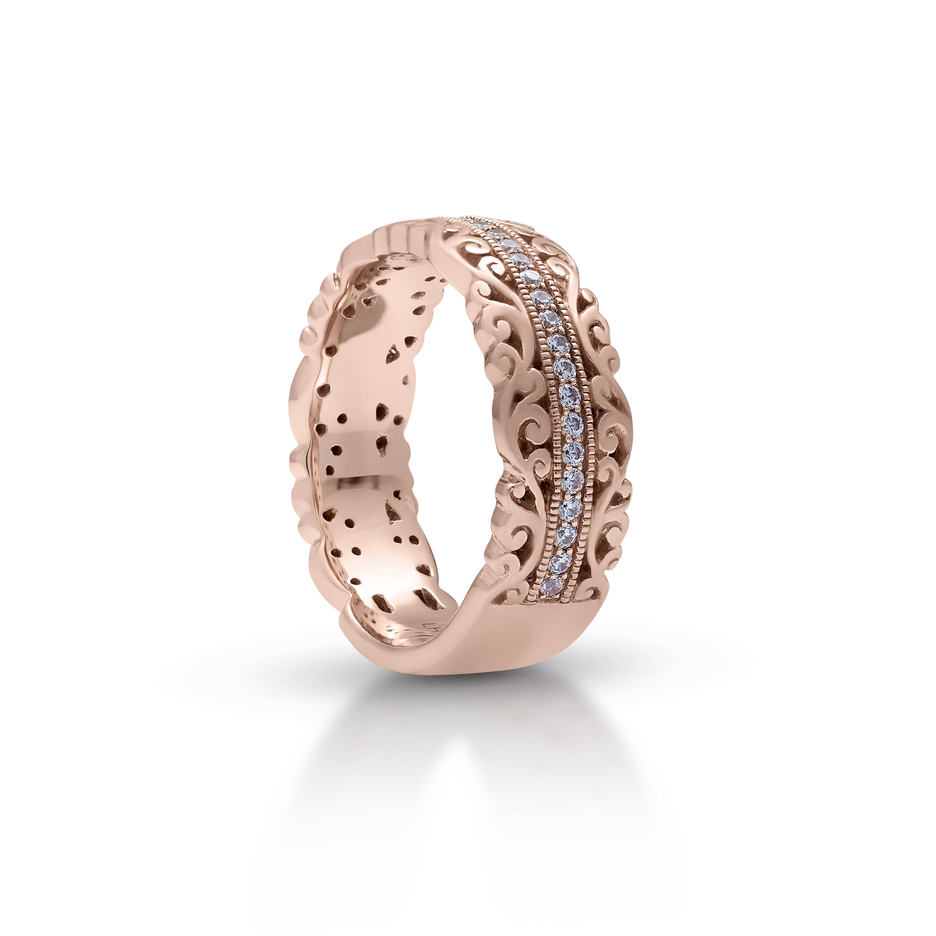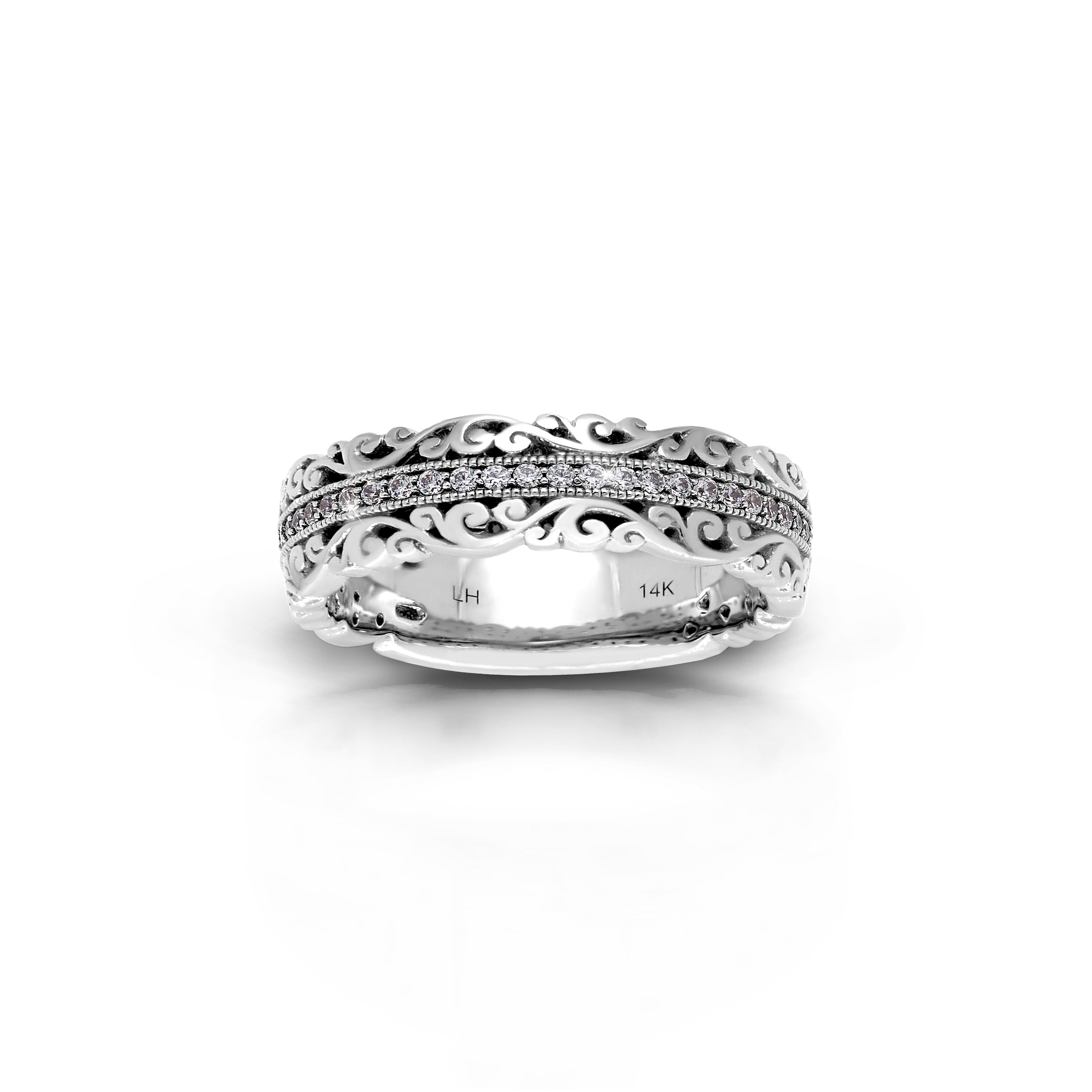 Embrace the timeless elegance of love with this Lois Hill intricately Hand-carved 0.29 ct Scalloped Scroll Wedding Band, where every delicate curve tells a tale of romance.  Its exquisite design, adorned with a radiant center row of diamonds, illuminates the journey of two hearts intertwined in eternal harmony.