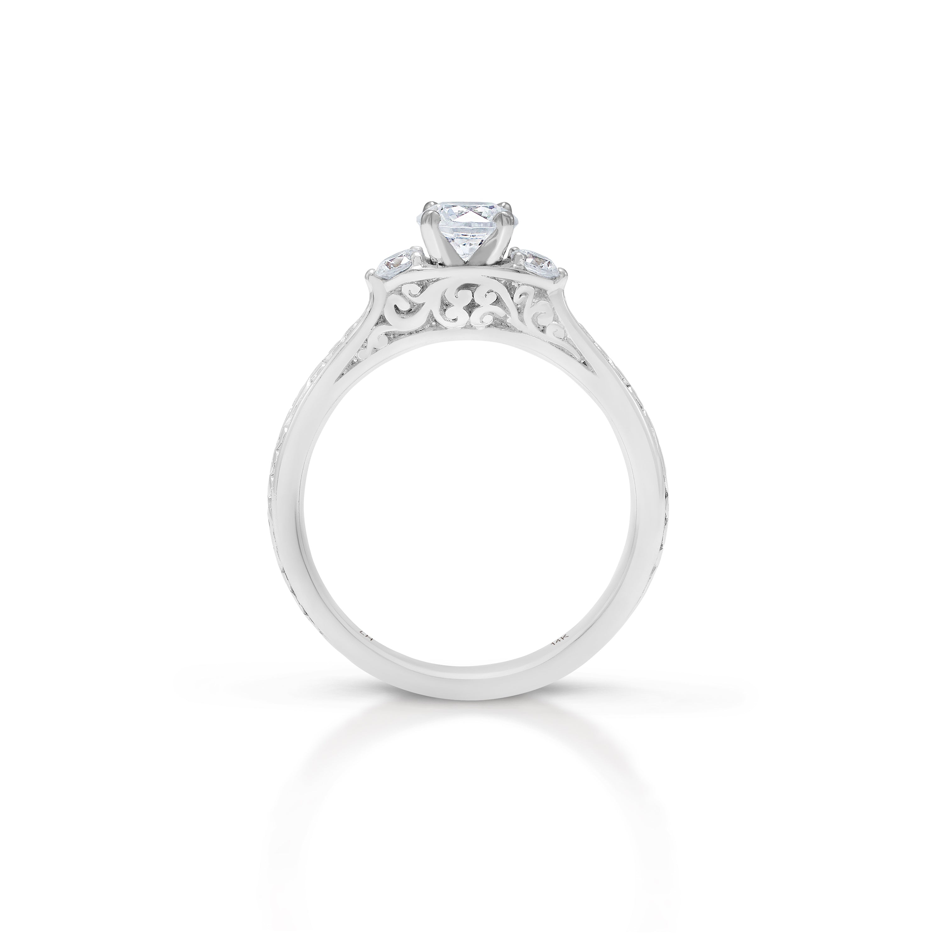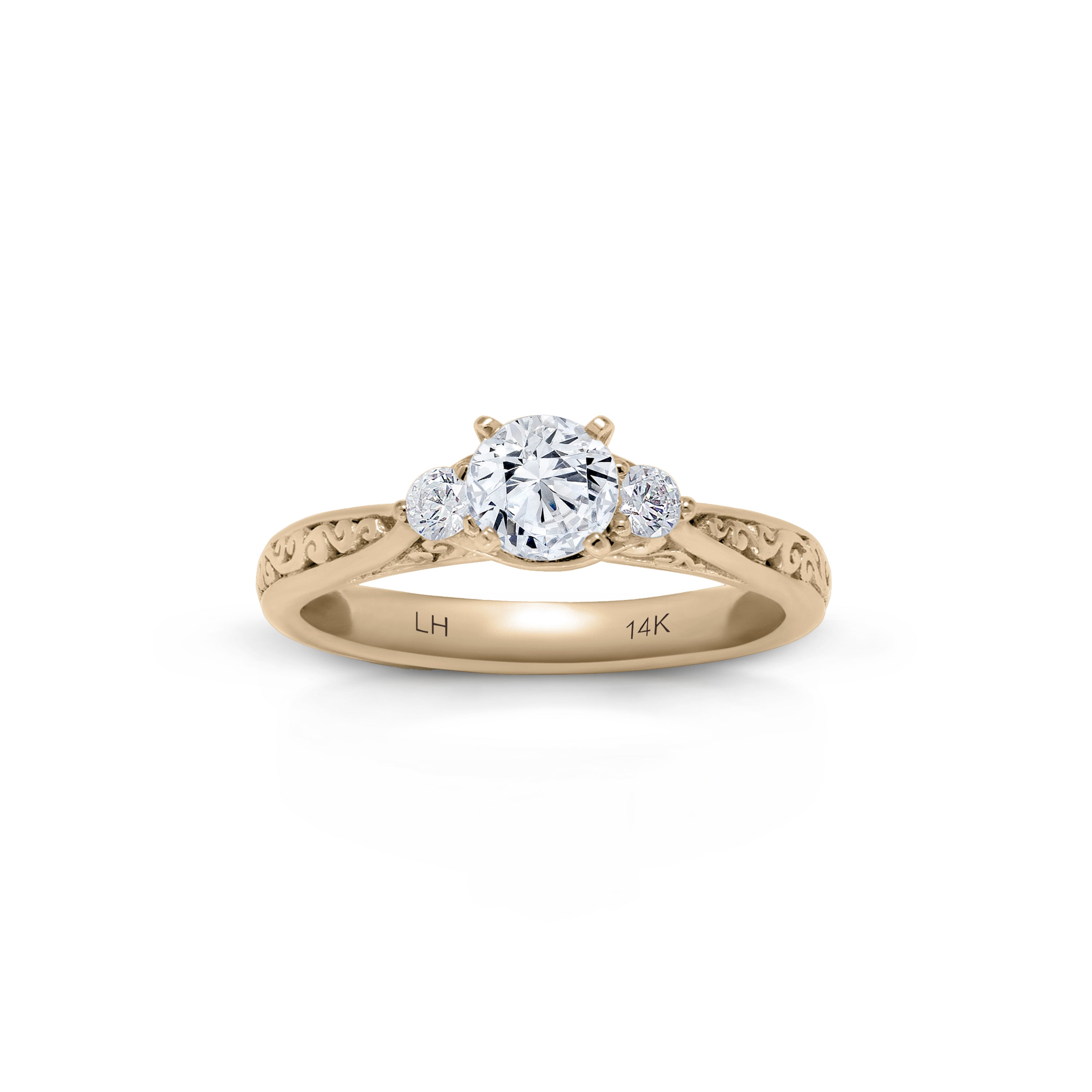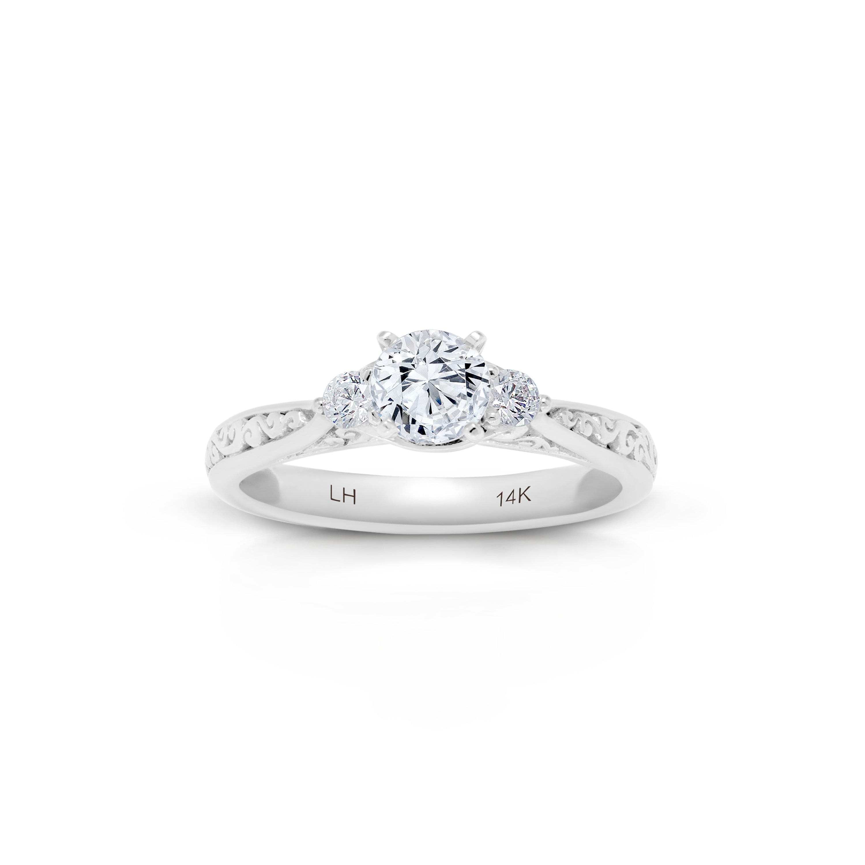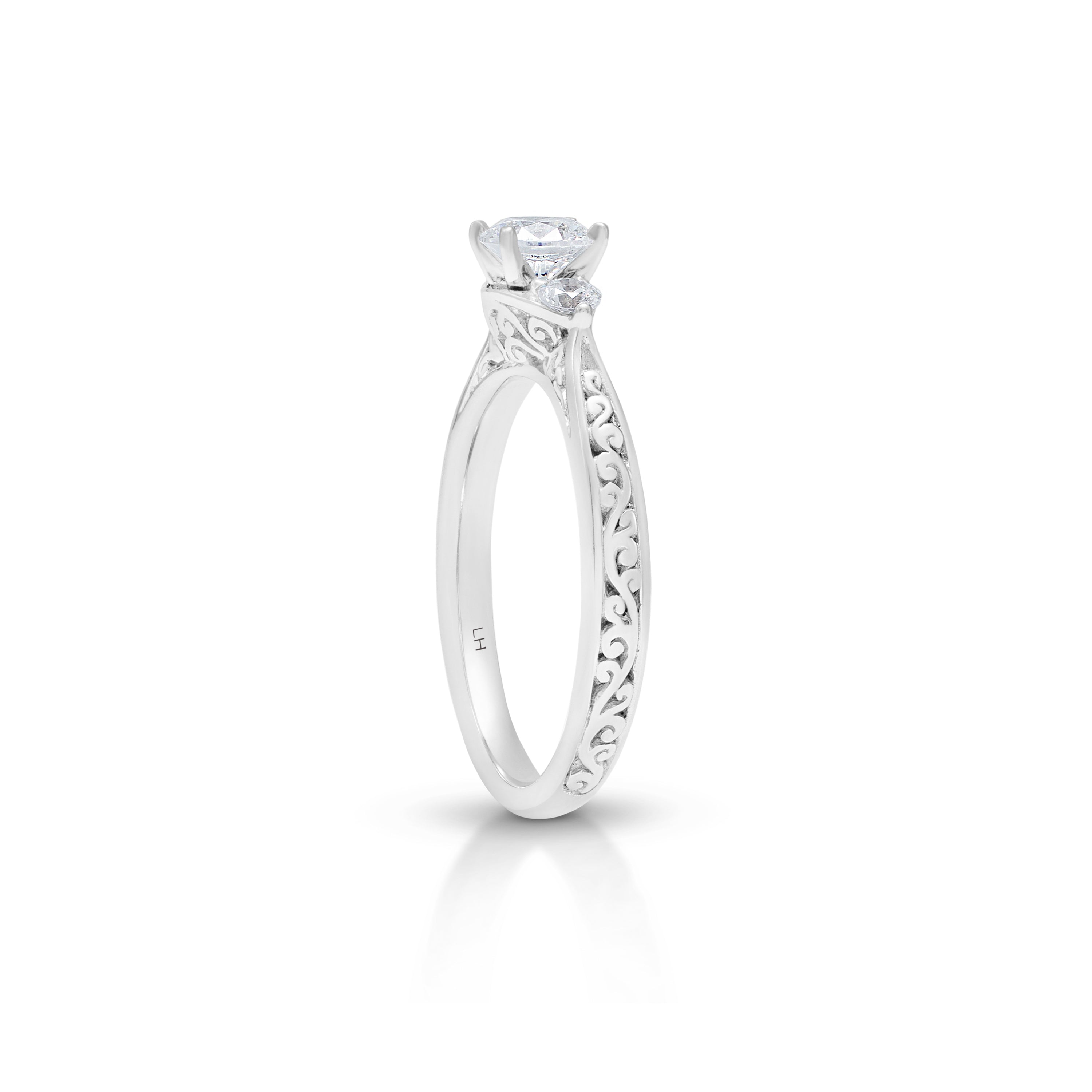 Embrace timeless elegance with the Lois Hill Hand-carved 2.9 mm Scroll Bostonian Engagement Ring, a captivating symbol of love and devotion.   Crafted with exquisite precision, its intricate scrollwork delicately intertwines with two brilliant 0.16 ct side stones, embodying the perfect blend of sophistication and romance.