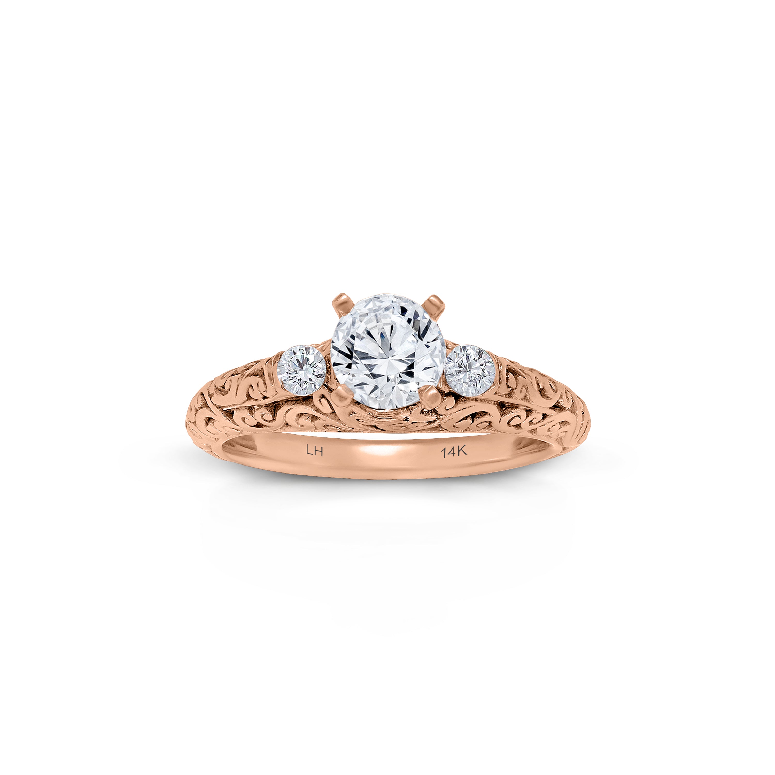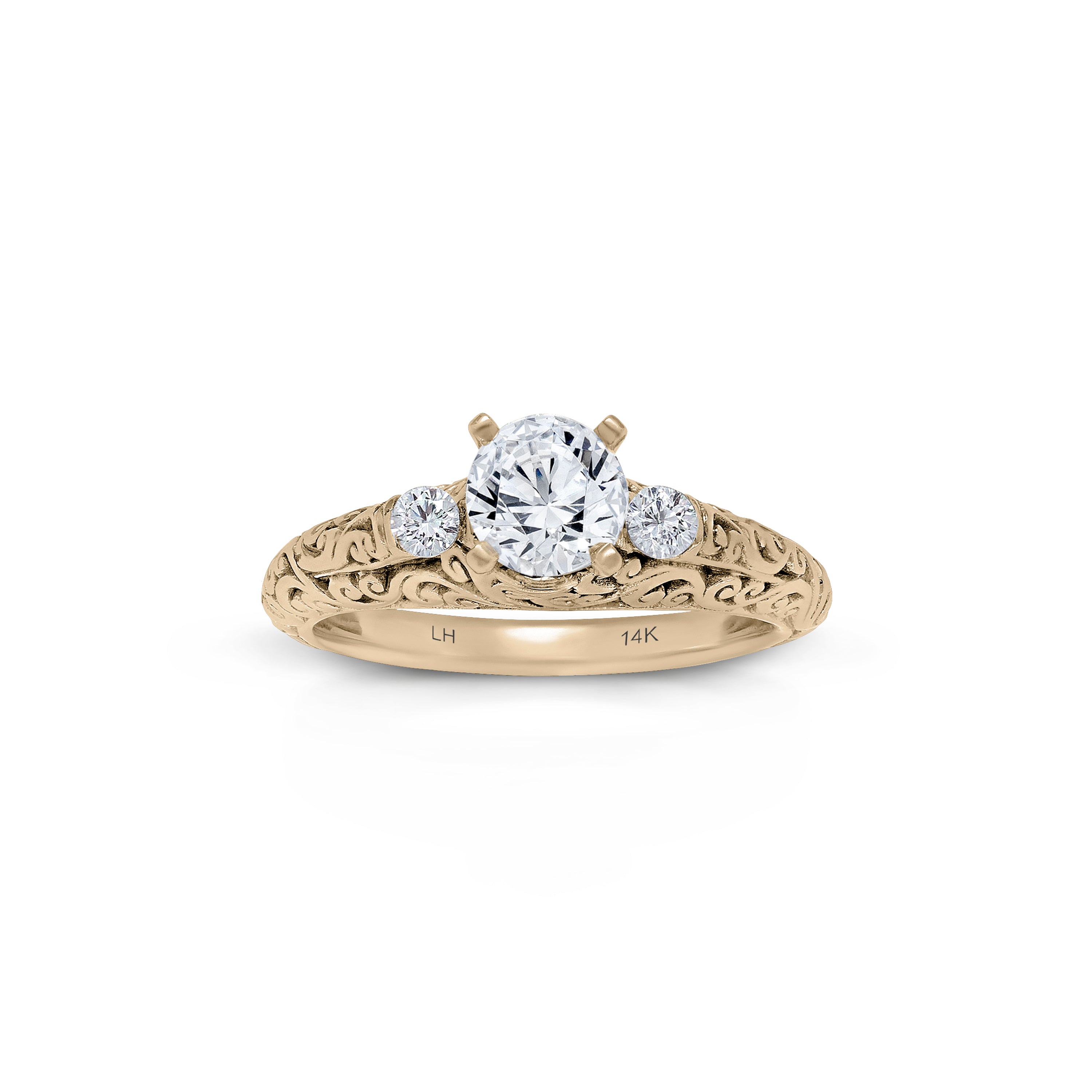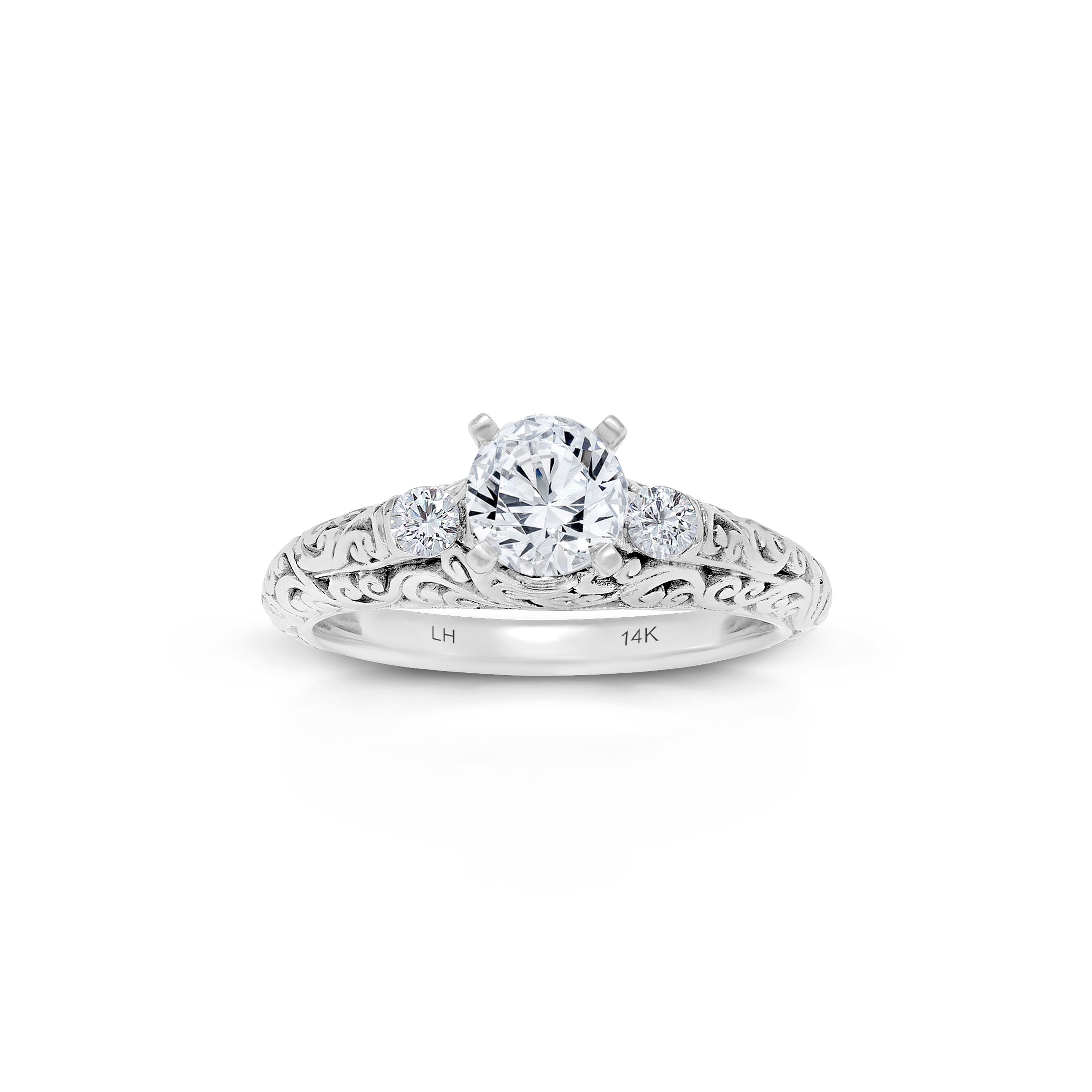 Crafted with exquisite artistry, this Lois Hill Hand-Carved Scroll Bostonian 0.14 ct Engagement Ring captures the essence of timeless elegance.   Its delicate band and gallery showcase our intricate LH scroll, gracefully intertwining with brilliant diamonds; creating a symbol of love that transcends time.