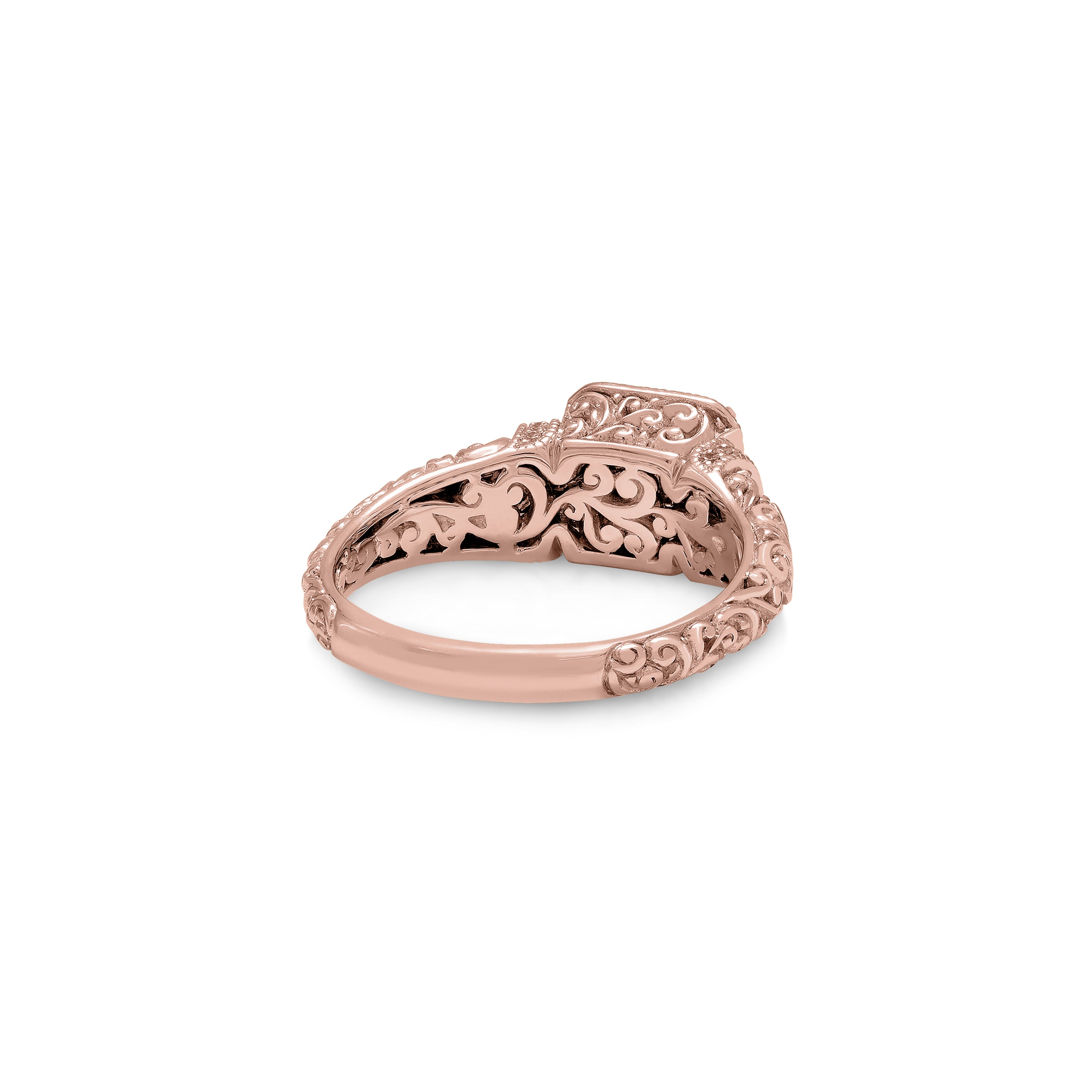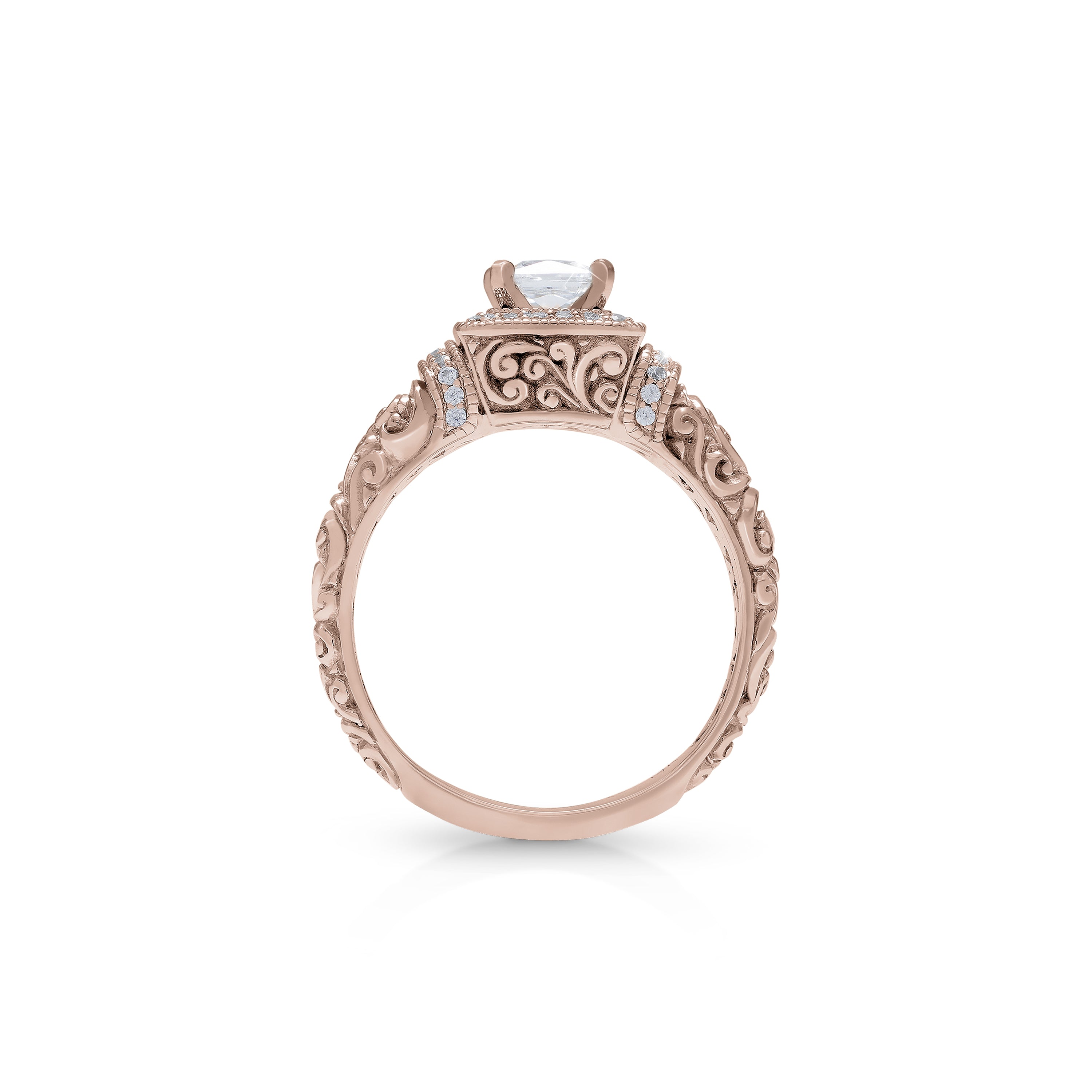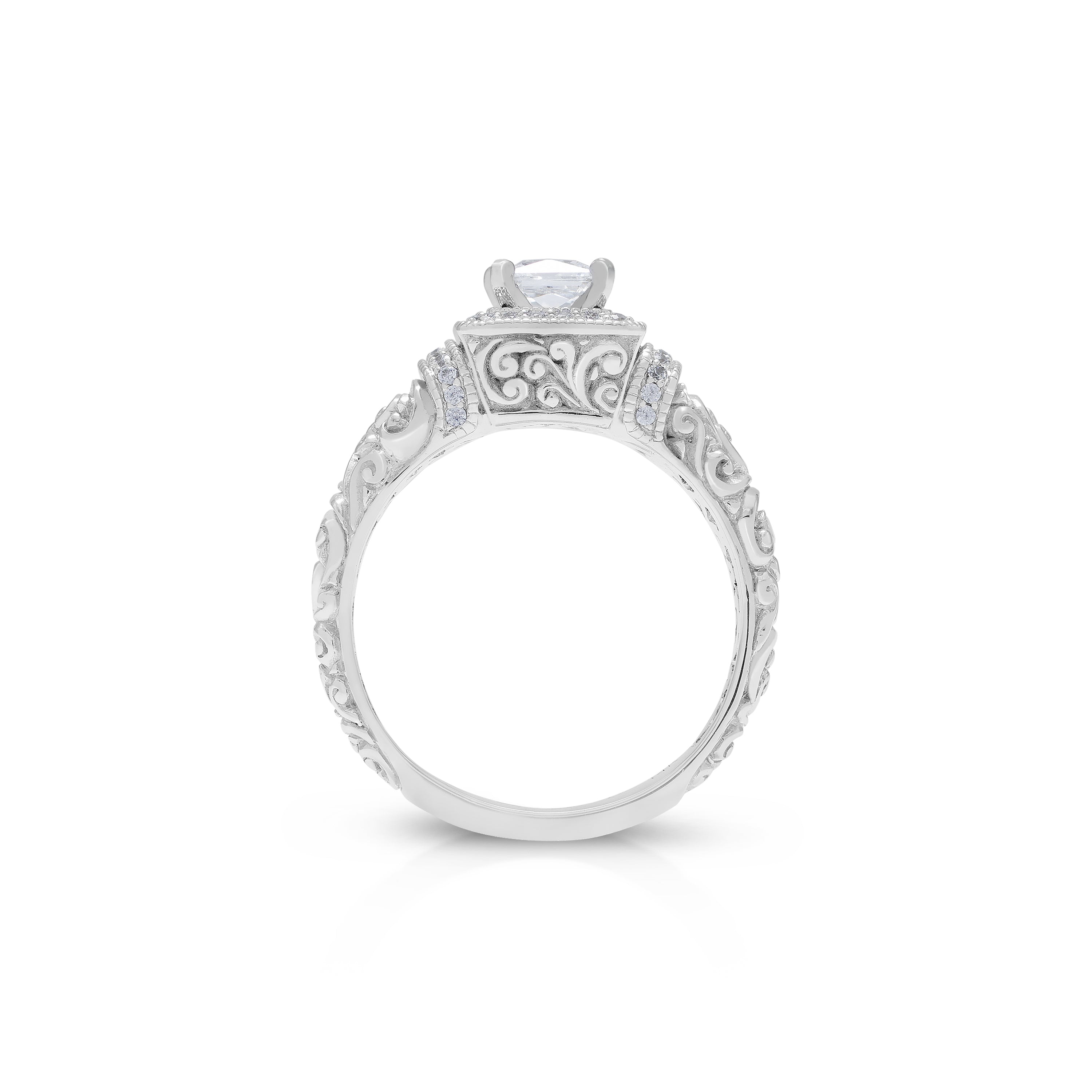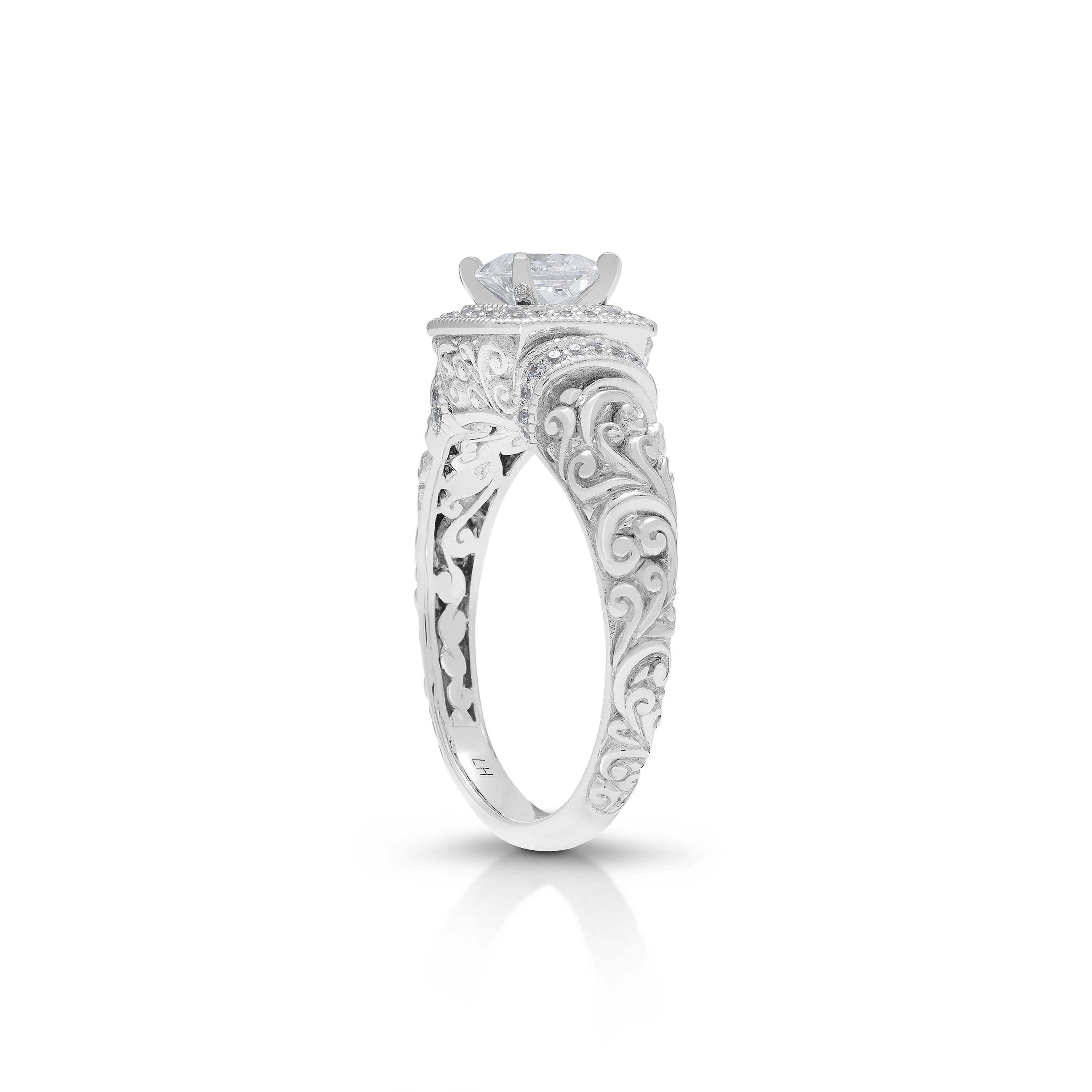 Stunning and exquisitely crafted, this Lois Hill Scroll Hand-Carved Repousse, Halo Engagement Ring with its dazzling 0.12 ct cushion halo of diamonds surrounding a brilliant center stone of your choice, captures the essence of romance, leaving a lasting impression of elegance and brilliance.