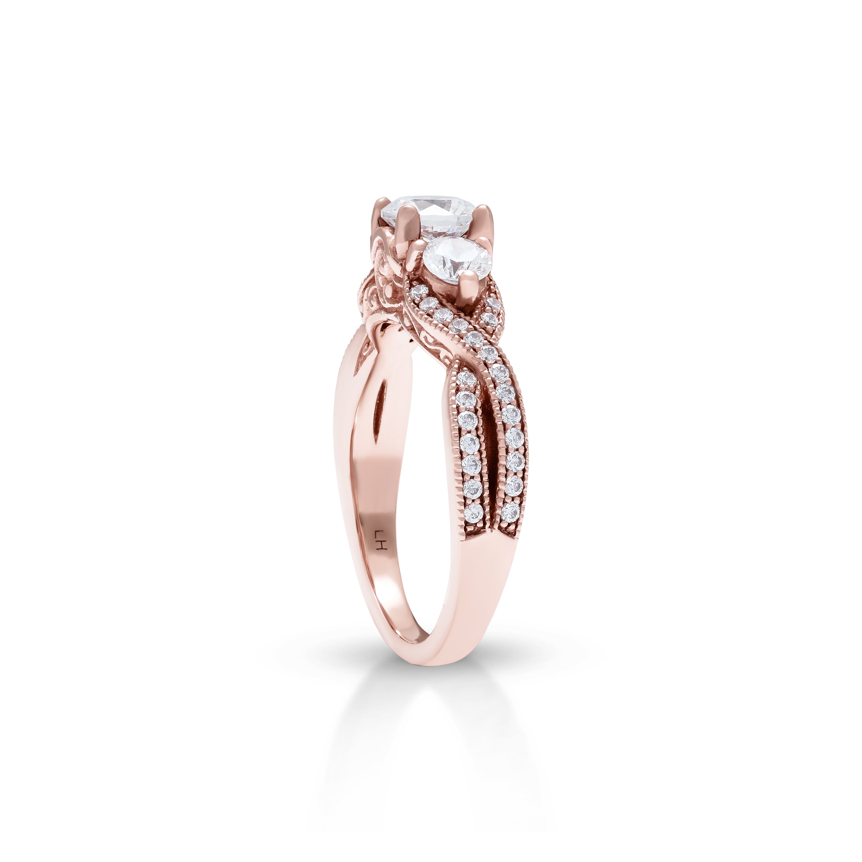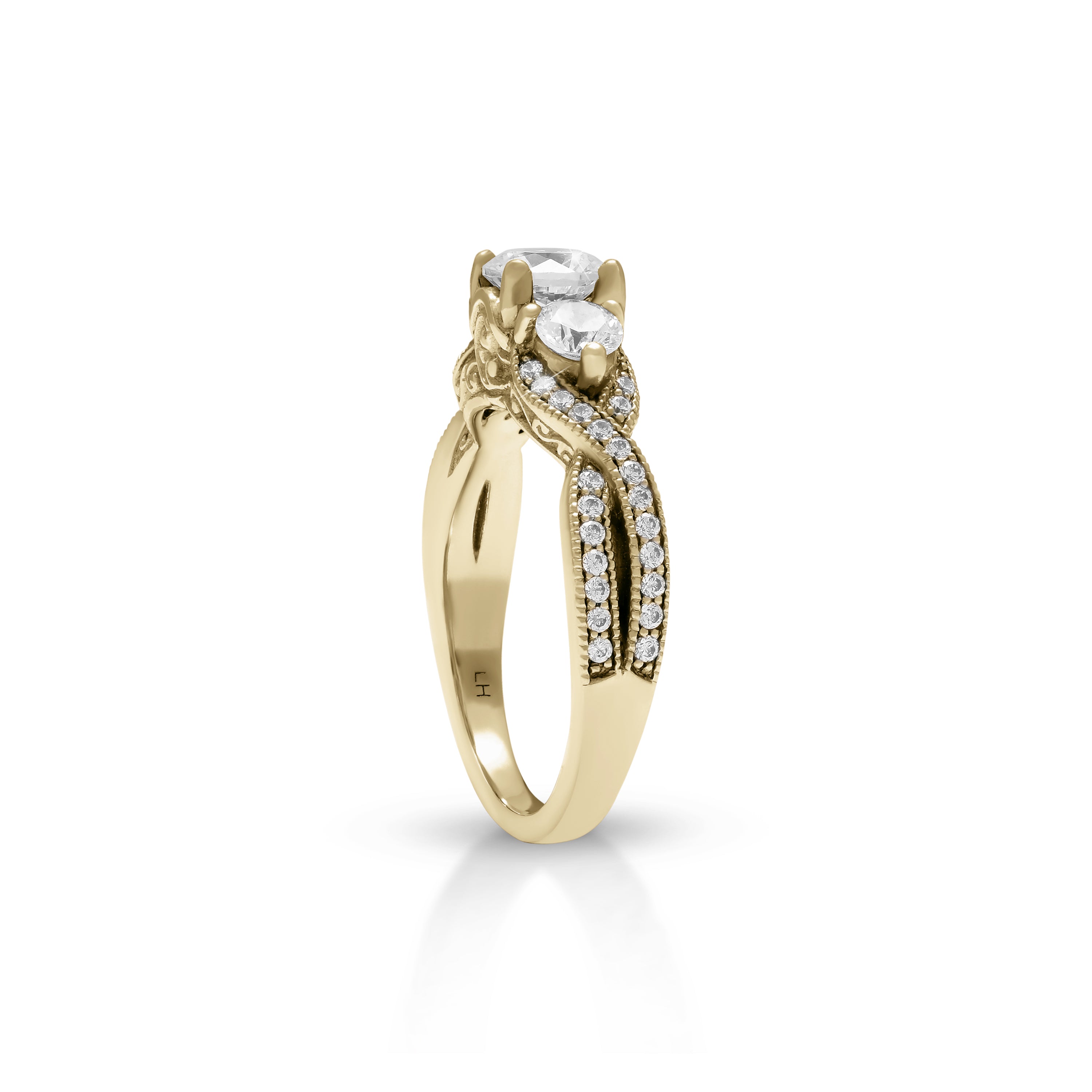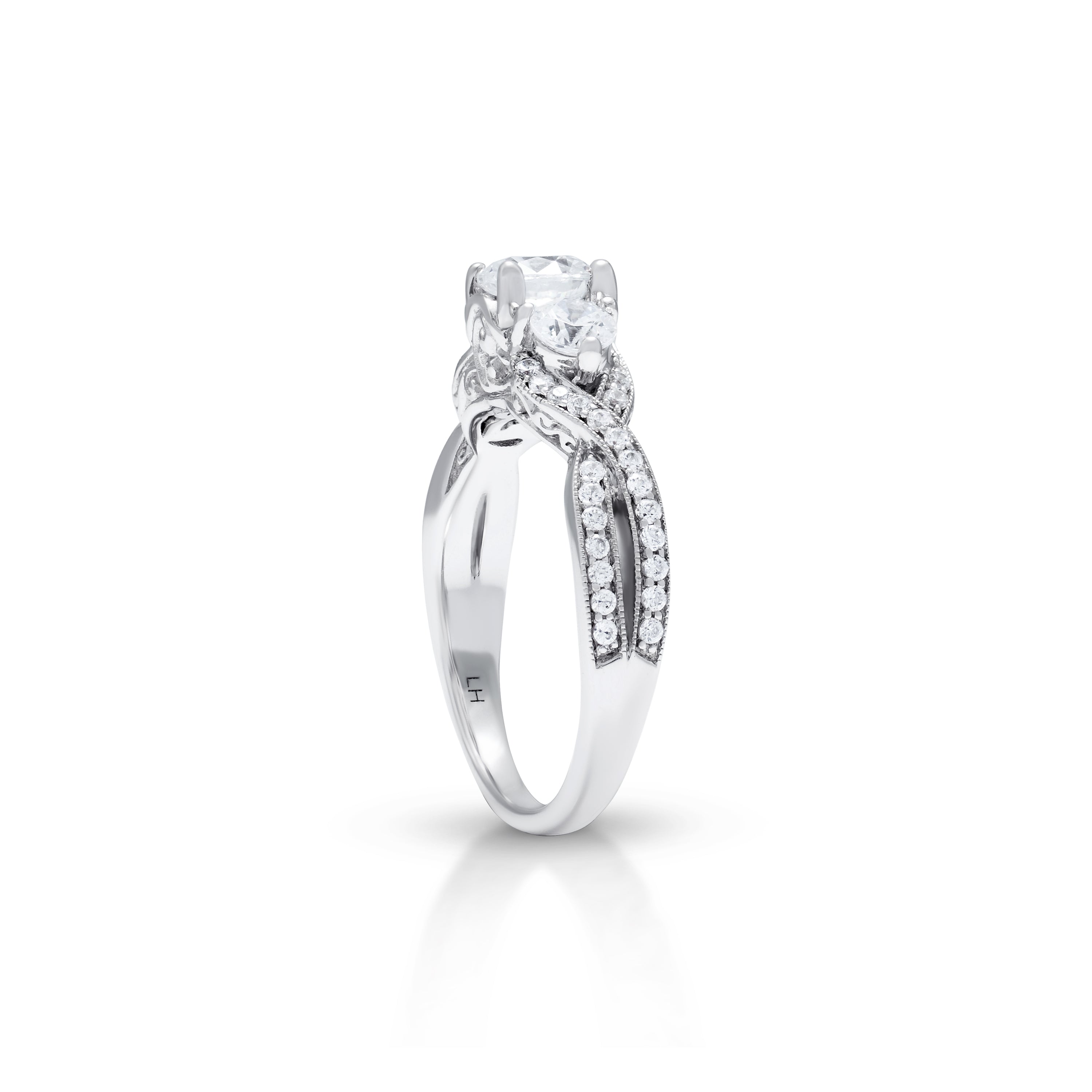 This Lois Hill Scroll Repousse, Diamond Twist, Bostonian Engagement Ring is a stunning symbol of love and commitment.   Crafted with intricate scrollwork, featuring a twisted band adorned with 0.6 ct sparkling diamonds, this exquisite ring blends timeless elegance with contemporary design, reflecting everlasting love.
