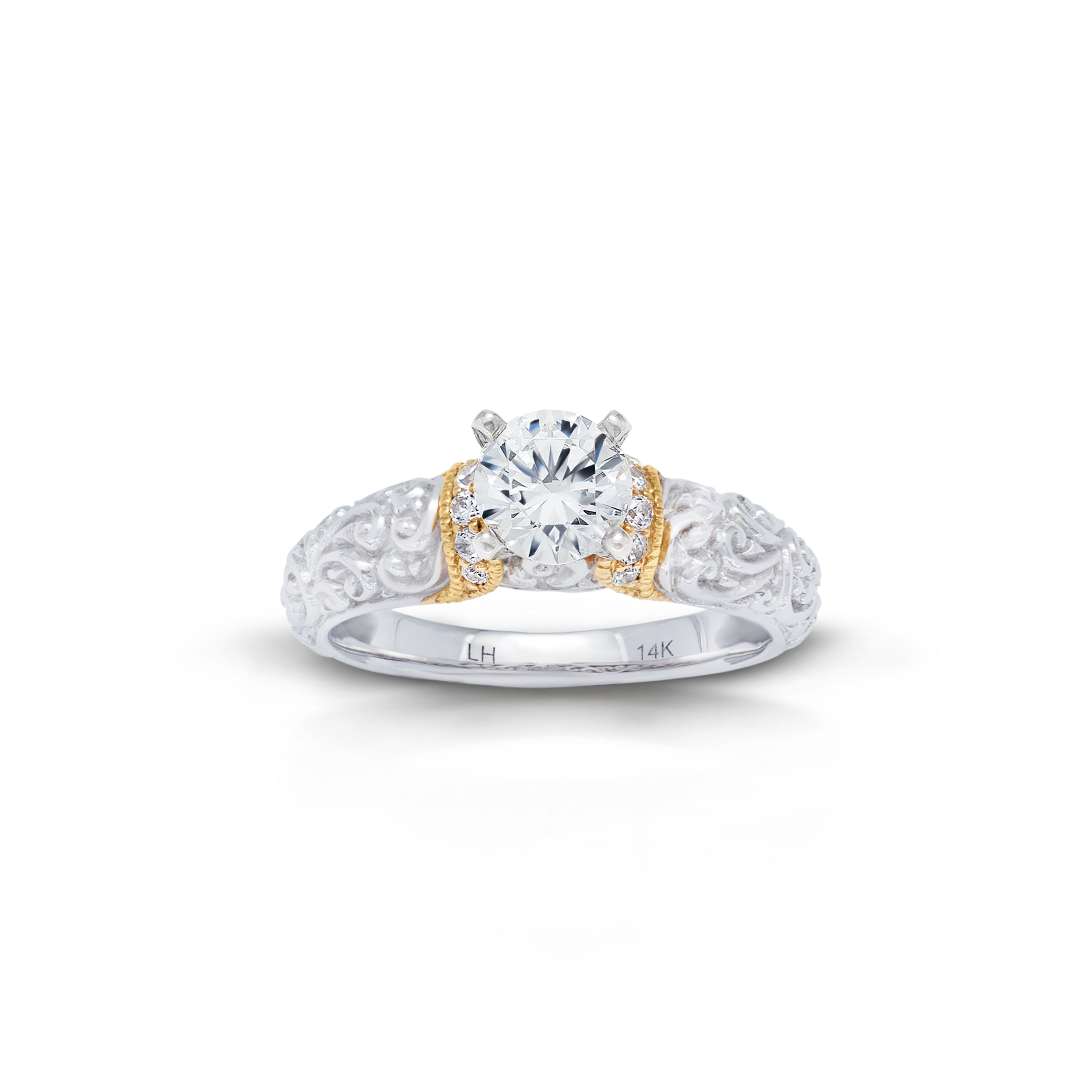 Elegantly crafted by skilled artisans, this exquisite Lois Hill Hand-carved Repousse Scroll Engagement Ring captures the essence of eternal love.  Intricate details intertwine with gentle hand-carved curves, showcasing a breathtaking center stone of your choice, embraced by delicate 0.1 ct diamond side accents, making it a timeless symbol of love and beauty.  This exquisite ring embraces harmonious contrast with its delicately intertwining two-tone gold accents.