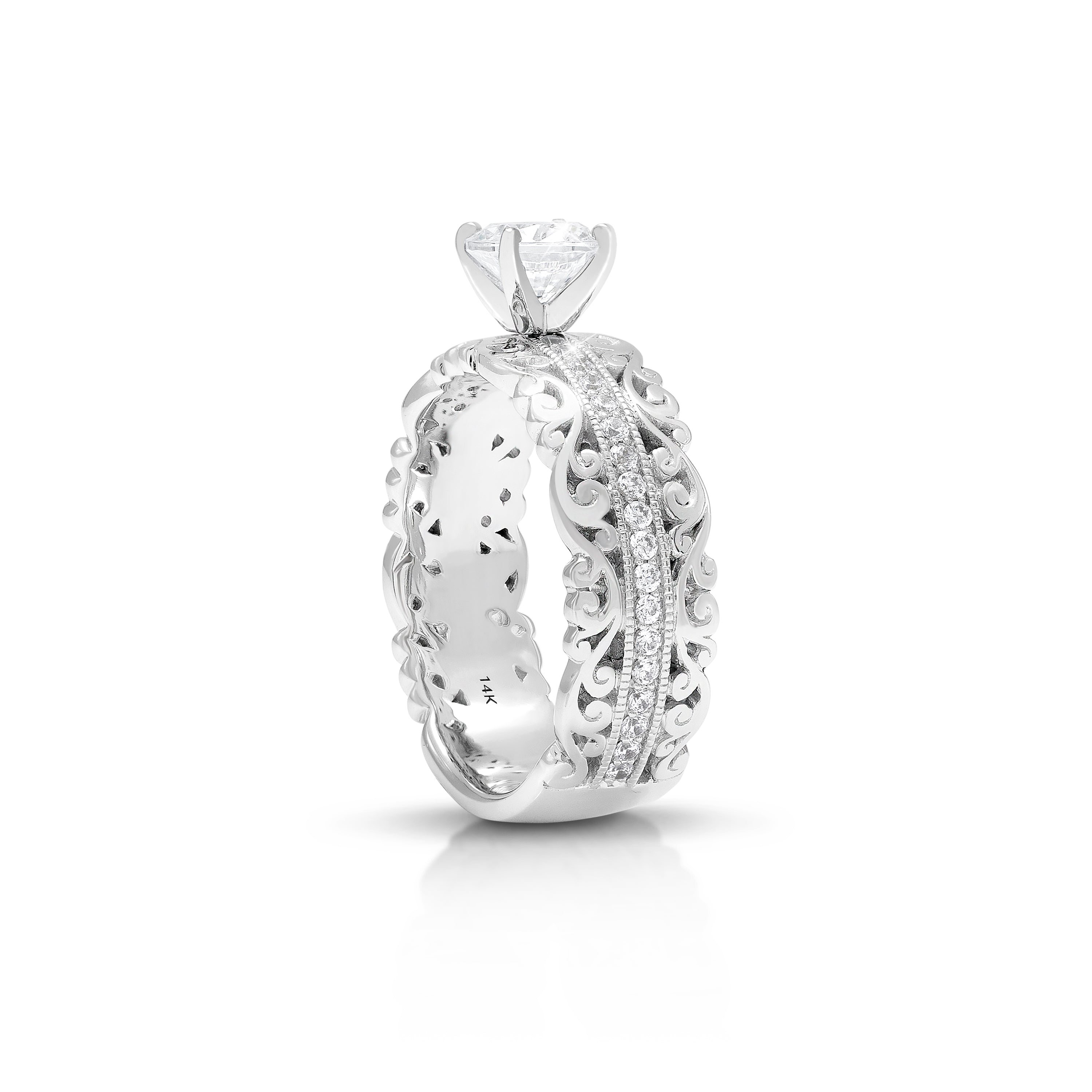 Graceful and enchanting, this exquisite Lois Hill Hand-carved Scalloped Scroll Solitaire Engagement Ring captures the essence of timeless romance.   Each delicate scallop gently embraces a dazzling row of 0.26 ct diamonds, creating a masterpiece of eternal love.