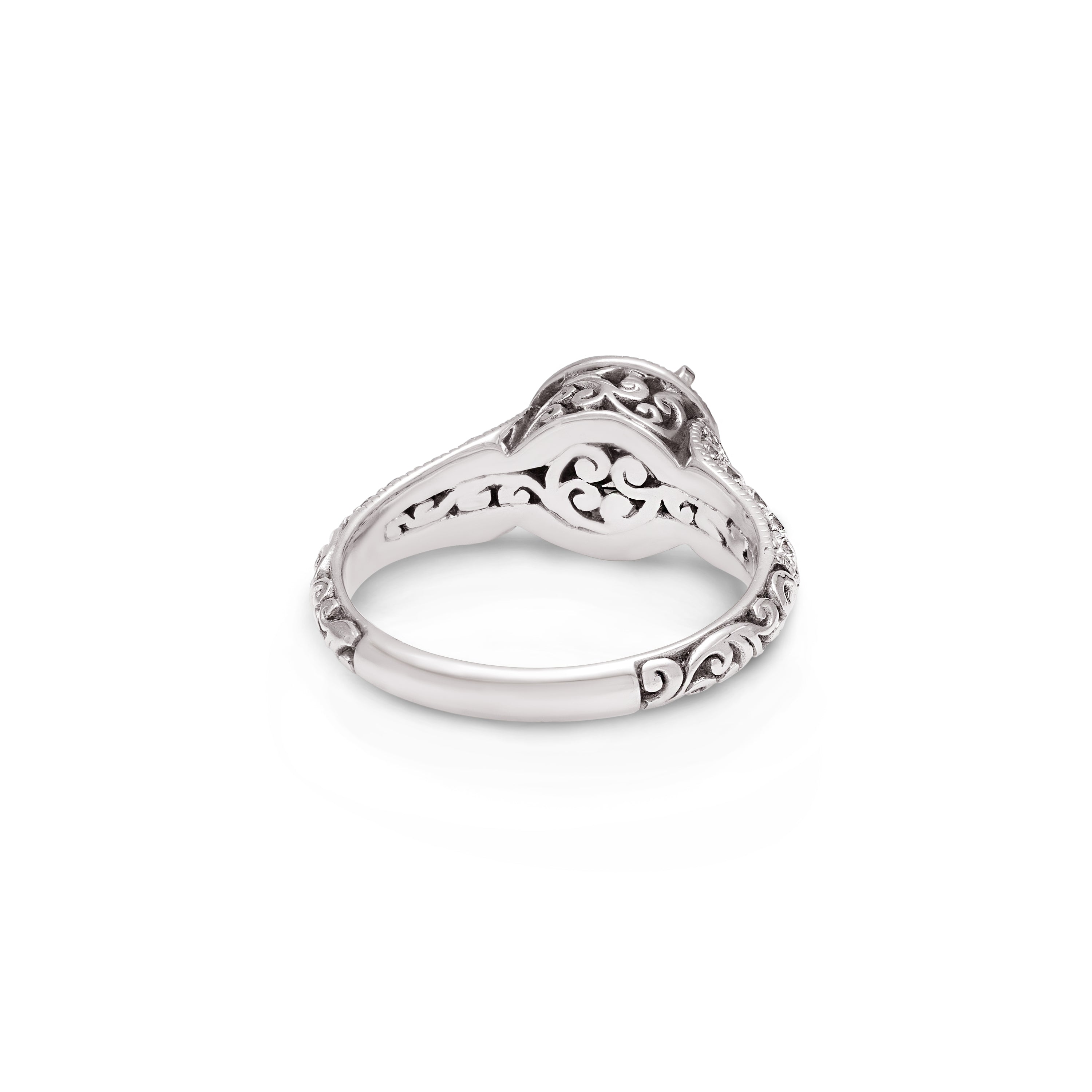 A masterpiece of unparalleled allure, this LH Hand-carved Scroll .65 ct Engagement Ring showcases two rows of glimmering, radiant diamonds which gracefully intertwine with beautiful LH Scroll.   An intricately adorned basket envelopes a halo of shimmering diamonds, creating an enchanting display of love and elegance.
