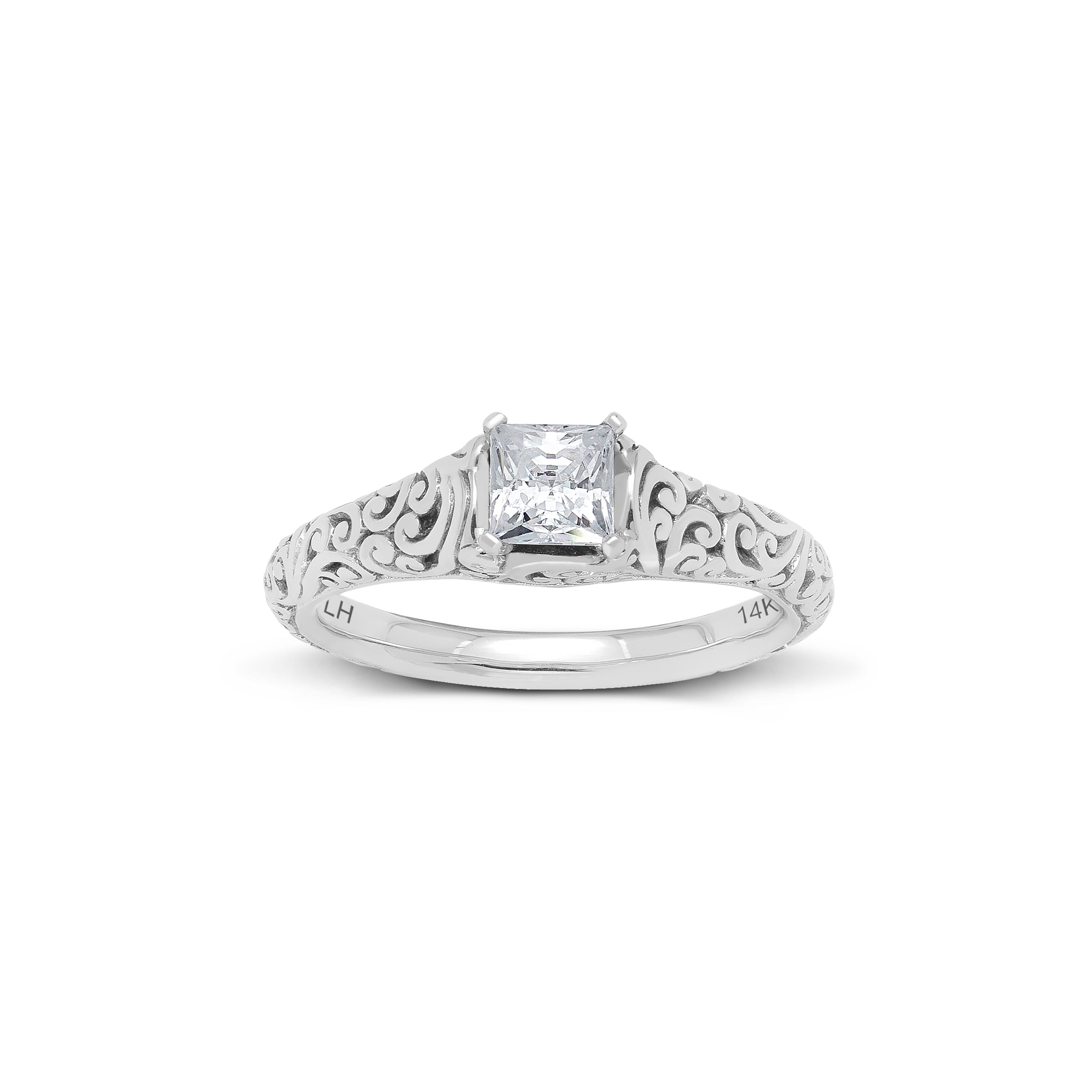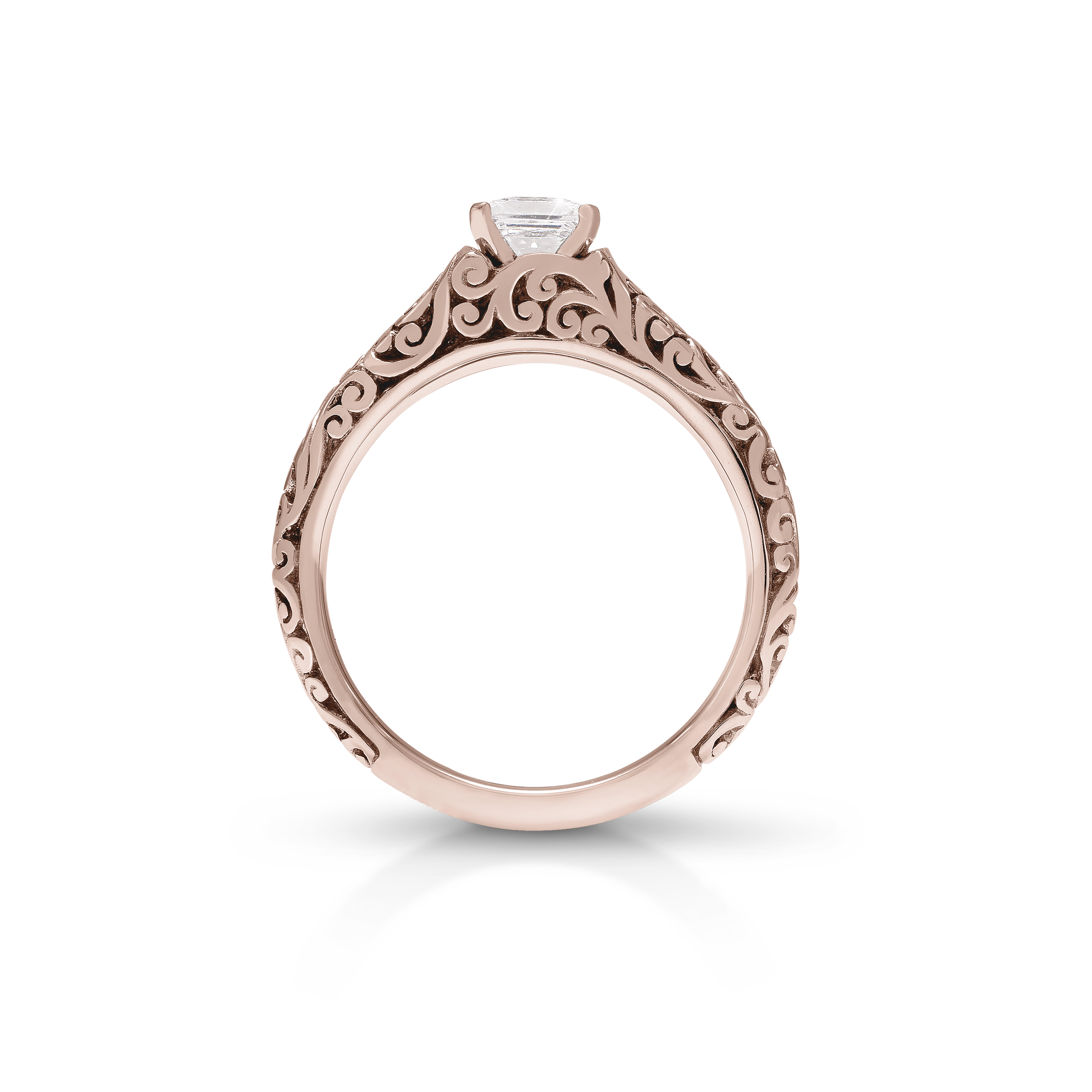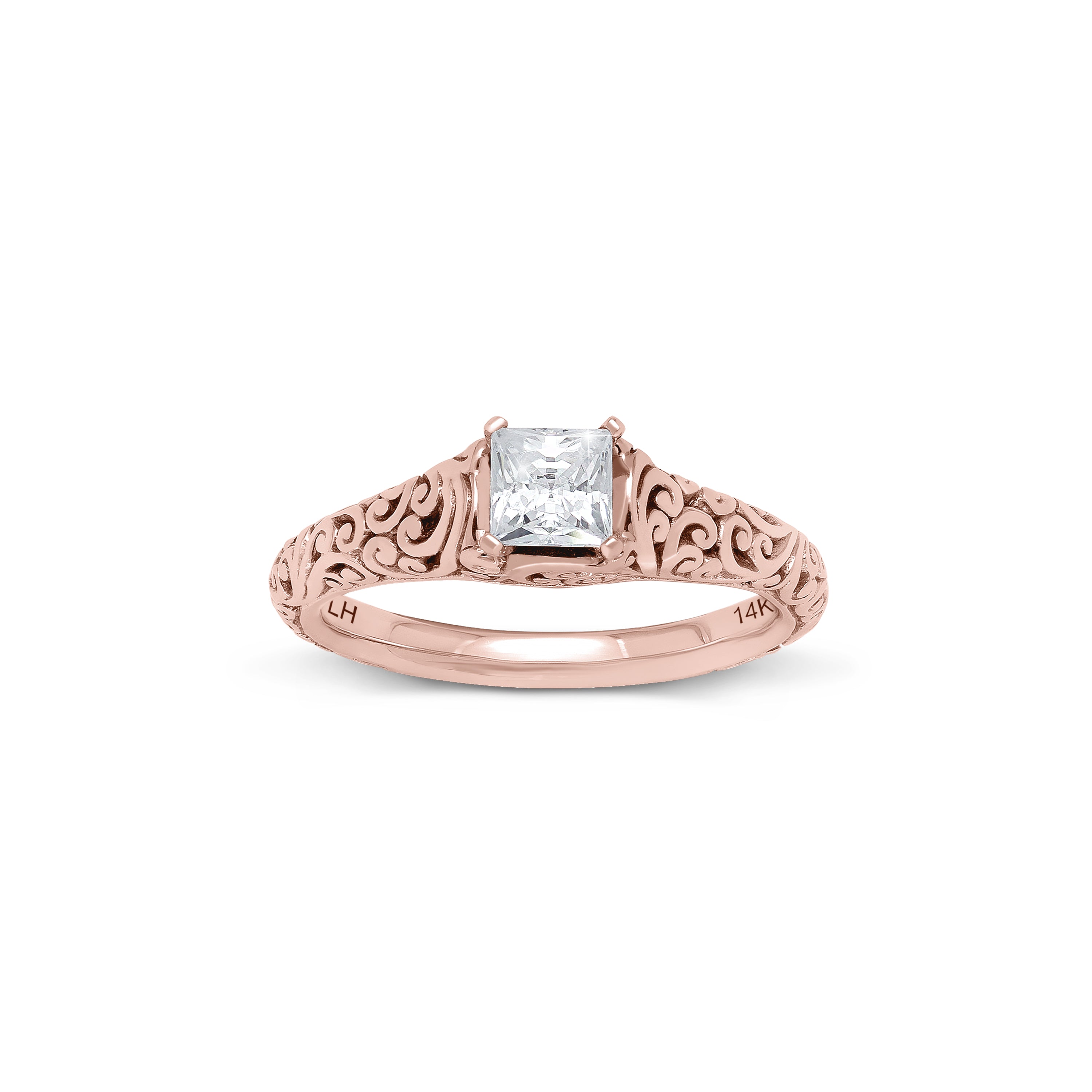 This breathtaking LH Hand-Carved Scroll Solitaire Engagement Ring, is meticulously crafted to showcase timeless beauty and capture hearts.   This masterpiece combines exquisite artistry with a single brilliant princess cut diamond of your choice, destined to symbolize everlasting love.